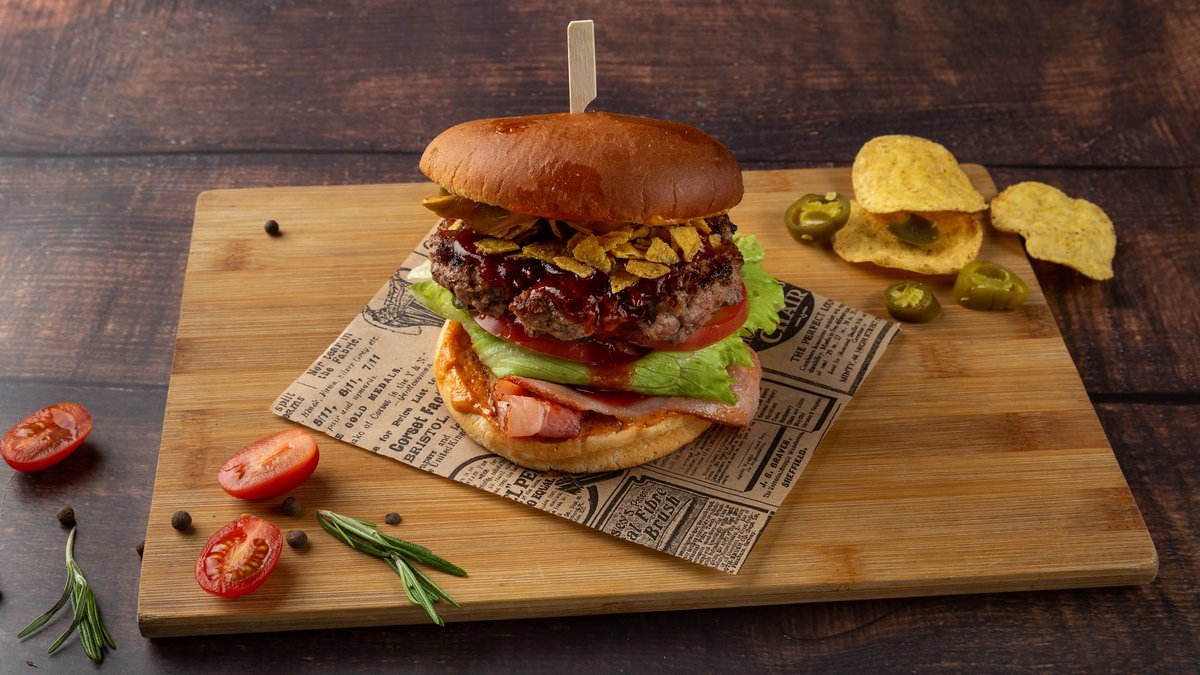 /LIELLOPA GAĻAS KOTLETE, ČEDARAS SIERS, HALAPENJO, BEKONS, KUKURŪZAS ČIPSI, TOMĀTS, MARINĒTS GURĶIS, LEDUS SALĀTI, BBQ MĒRCE, EZĪŠA ASĀ MĒRCE/