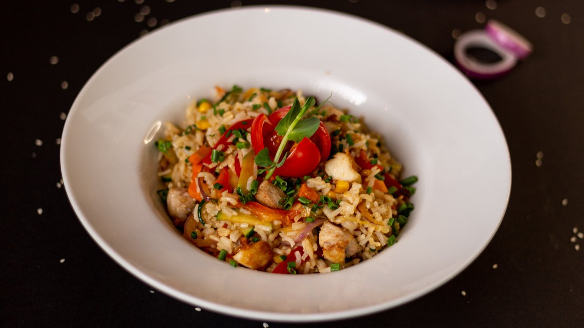 Vistas filejas gabaliņi sojas-medus mērcē ar basmati rīsiem un dārzeņiem