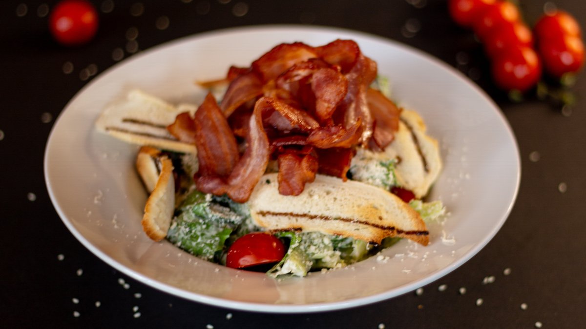 Cēzara salāti ar bekonu un ķiršu tomātiem