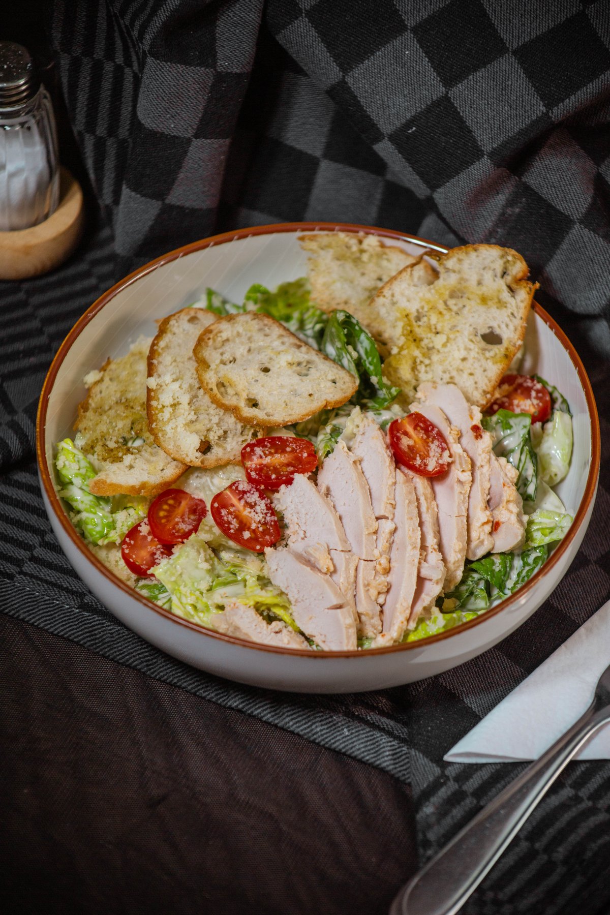 Klasiskie Cēzara salāti, kas gatavoti no - Romiešu lapas Cesara mērce Cietais siers Vistas fileju