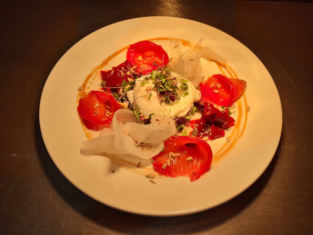 Laša gravadlax, plaucēta vistas ola, pilngraudu sēklu maizes grauzdiņš, redīsi, marinētas bietes, dažādu lapu un mikrosalātu mikss, cidoniju- eļļas mērce, sēklu mikss