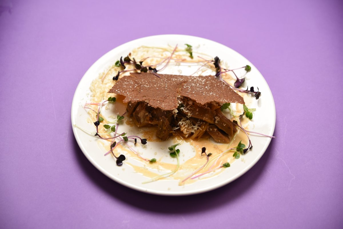 Vārīta liellopa mēle, karstie ziemas celmeņu un kimchi salāti, pikanta majonēze, mārrutku sniegs un rudzu maizes čipsis (1; 6; 9; 10; 11)