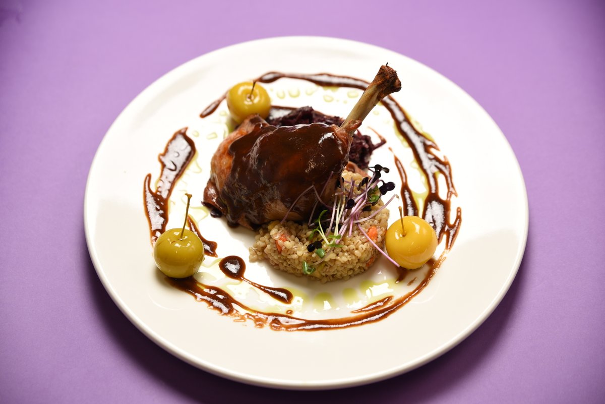 Cāļa kājas konfits, pērļu grūbas, štovēti sarkanie kāposti, sarkanvīna mērce, paradīzes ābolīši (1; 6; 9; 12)