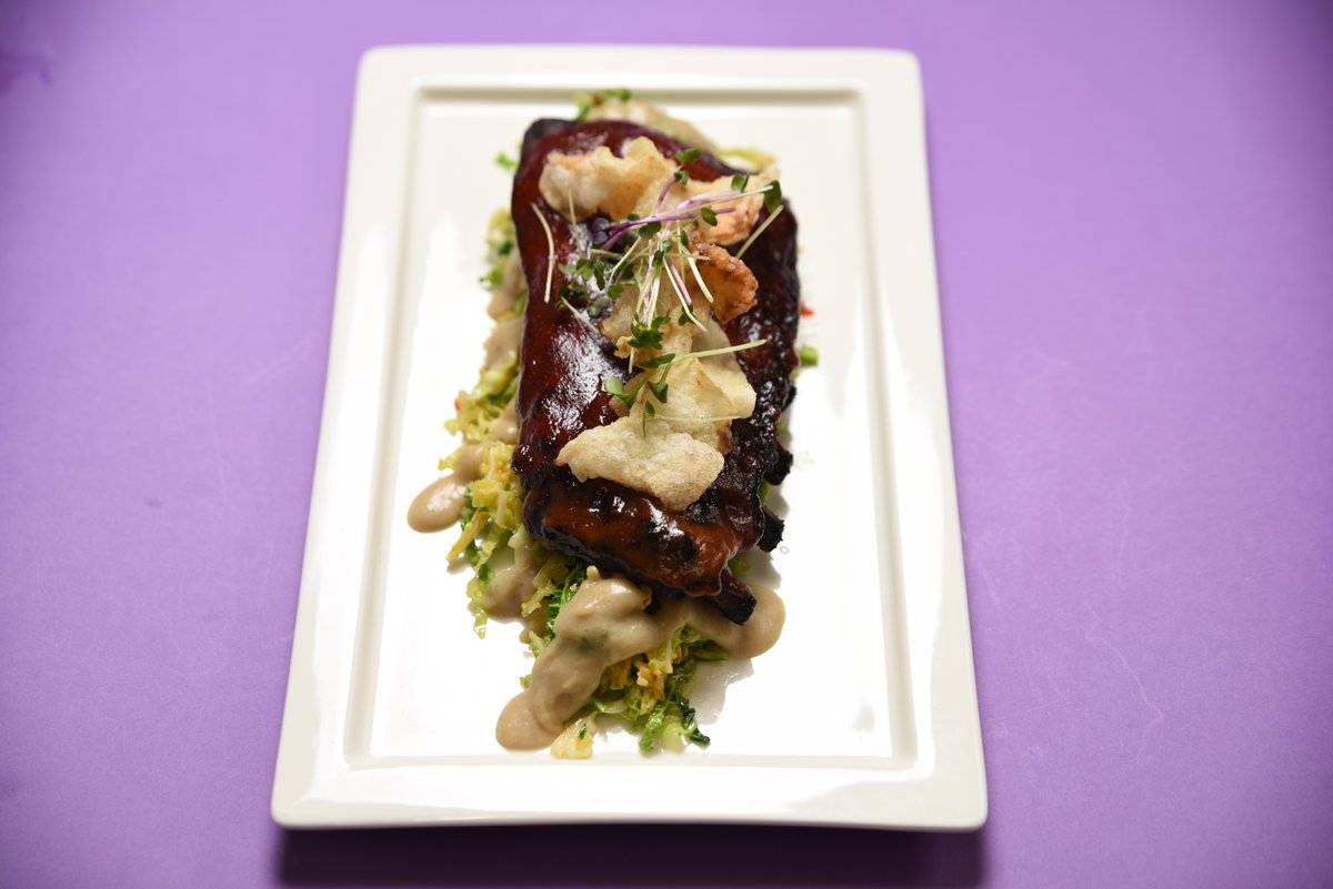 Lēni gatavinātas BBQ glazētas ribiņas, ingverā cepti kāposti baltvīna mērcē un kolrābja čipsi (1; 6; 7; 9; 10; 12)