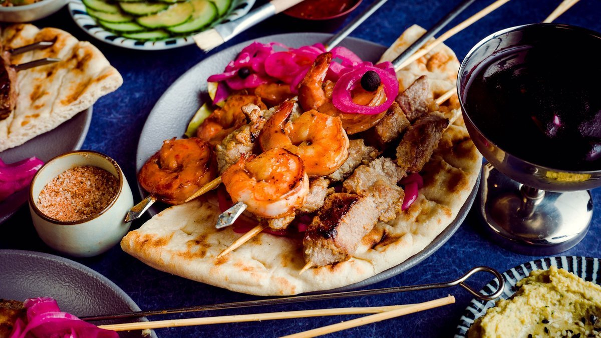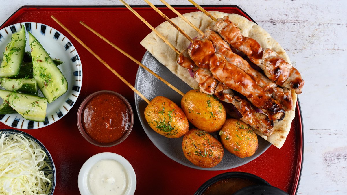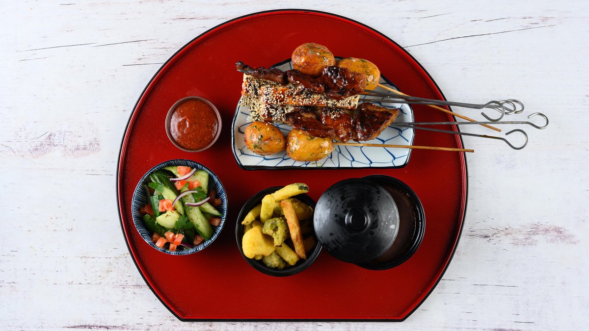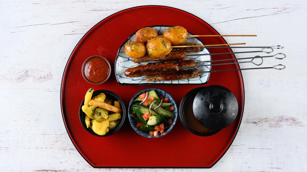 Grilētu iesmu komplektā ietilpst - sildošs un sātīgs buljons, marinēti Latvijas kāposti ar cūku pupām, marinēti/sālīti gurķi, sarkanvīnā noturēti sīpoli, tomātu / valriekstu salāti, frī kartupeļi un tempuras dārzeņi, grieķu jogurta glazūra, tomātu mērce ar Svānu sāli, humuss, cepta maize.
