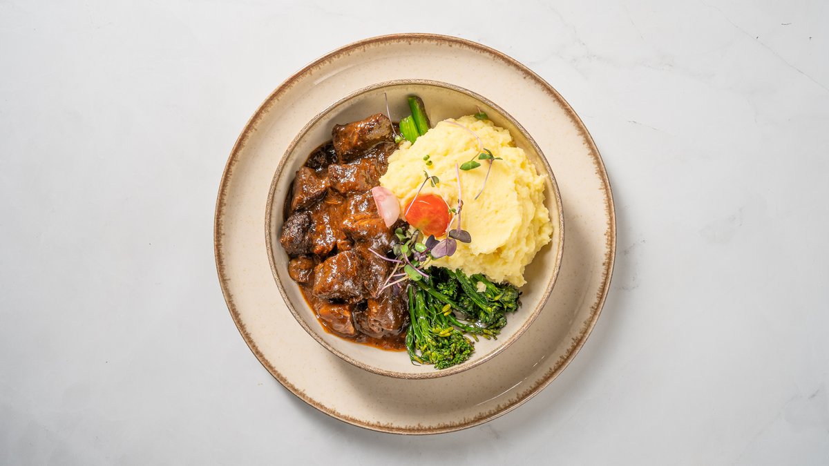 Liellopa gaļas sautējums, pasniegts ar sēnēm, bekonu un kartupeļu biezeni