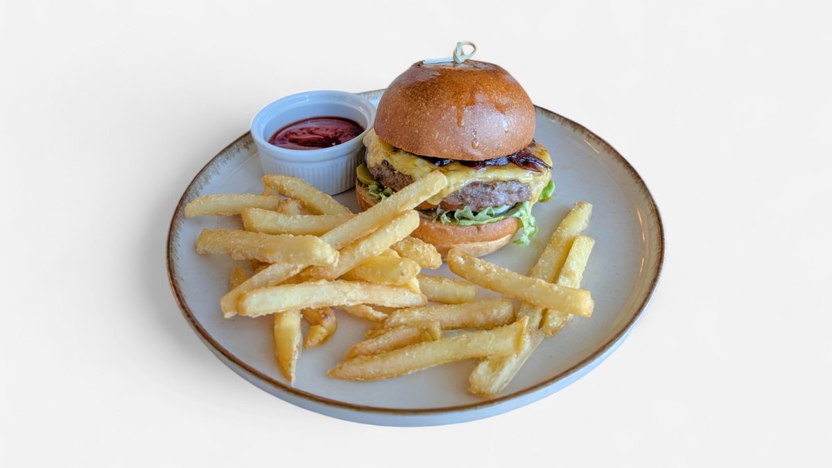 Liellopa burgers ar kartupeļiem fri un trifeļu mērci