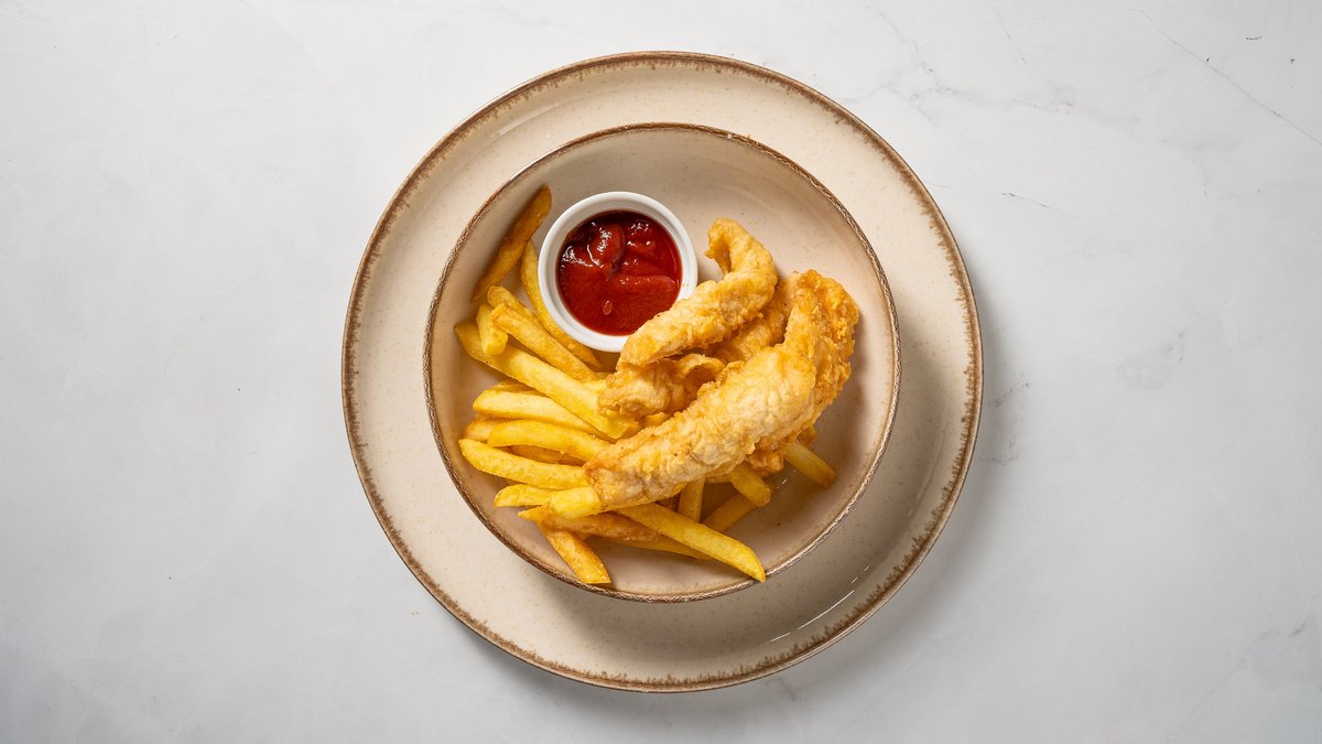 Pašgatavotas vistas strēmelītes ar kartupeļiem frī un kečupu