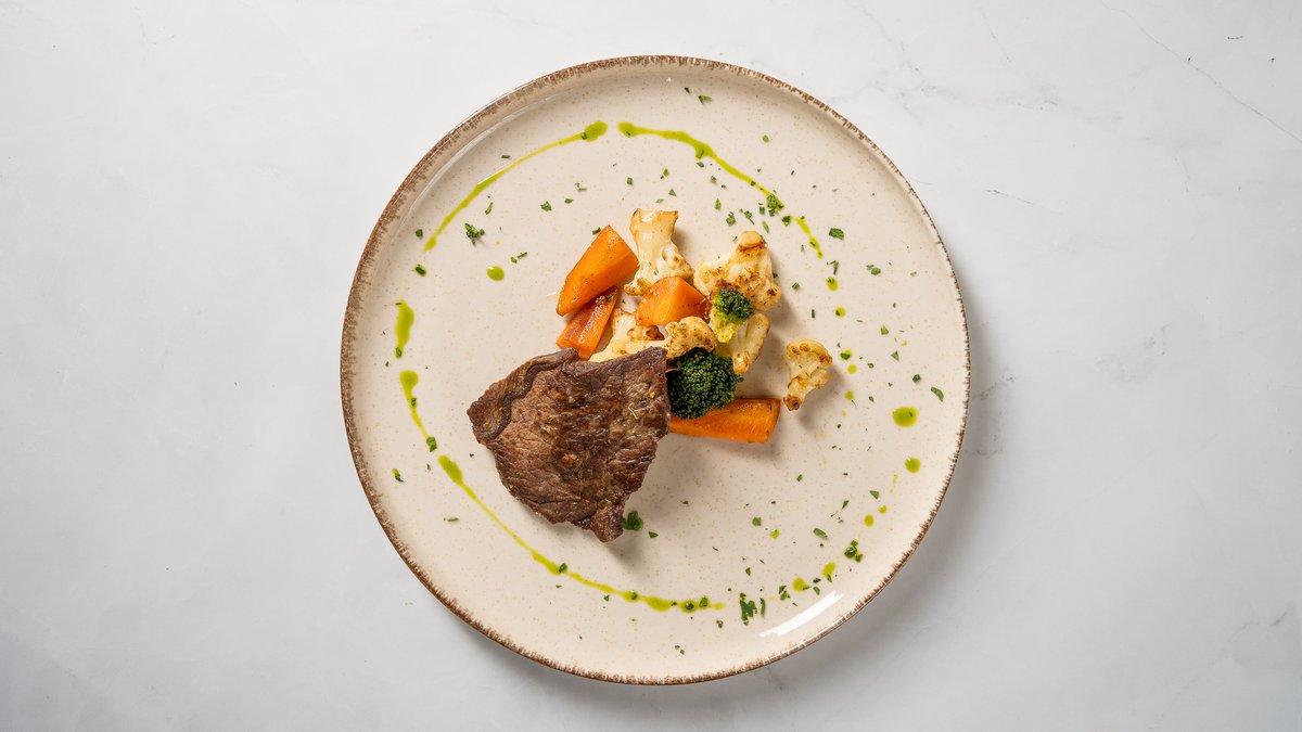 Liellopa steiks (1. min cepts) ar ceptiem vai svaigiem dārzeņiem