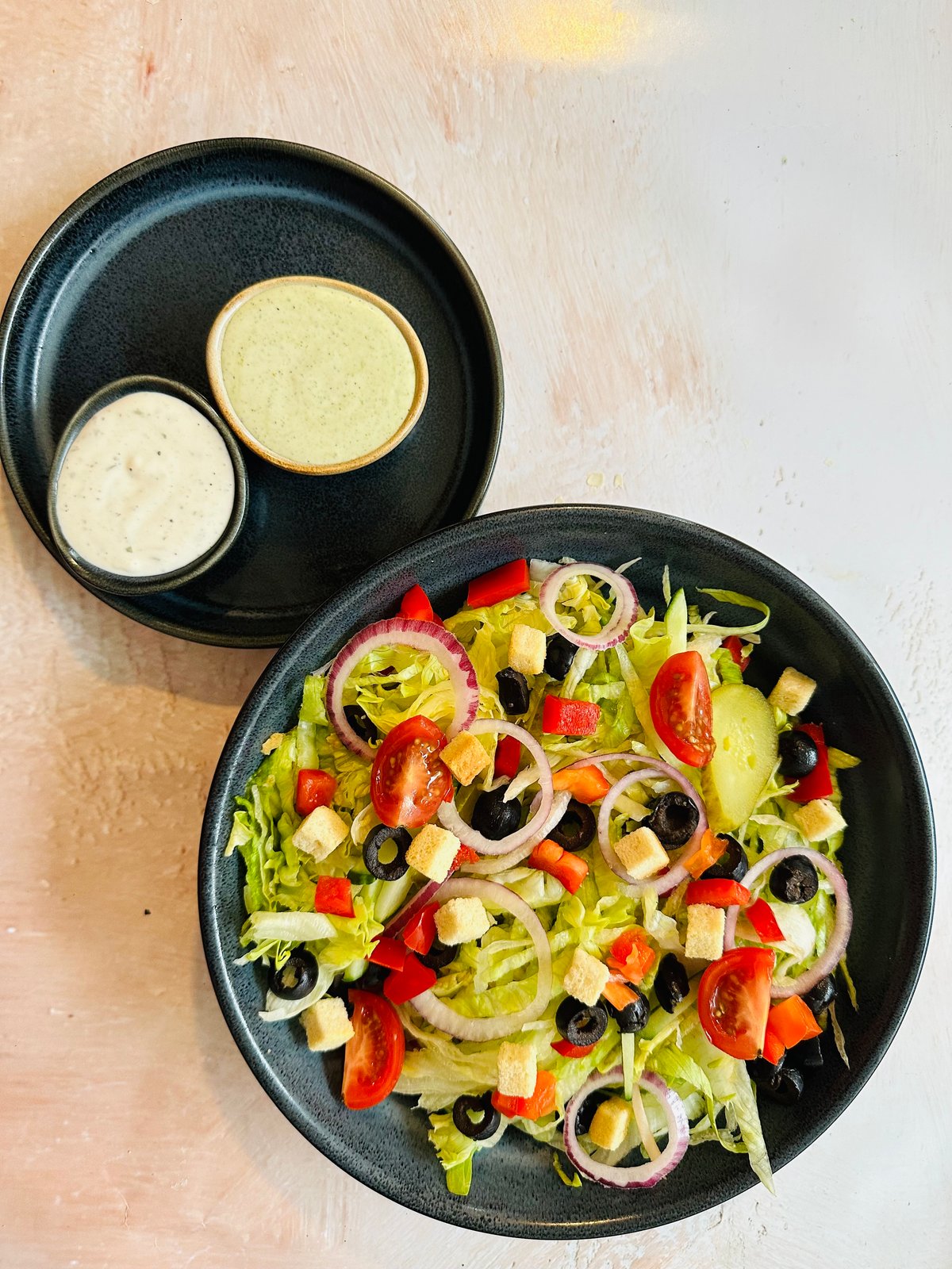 Veģetāra kotlete ar svaigiem salātiem un mērci pēc jūsu izvēles