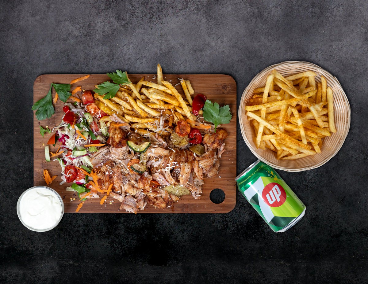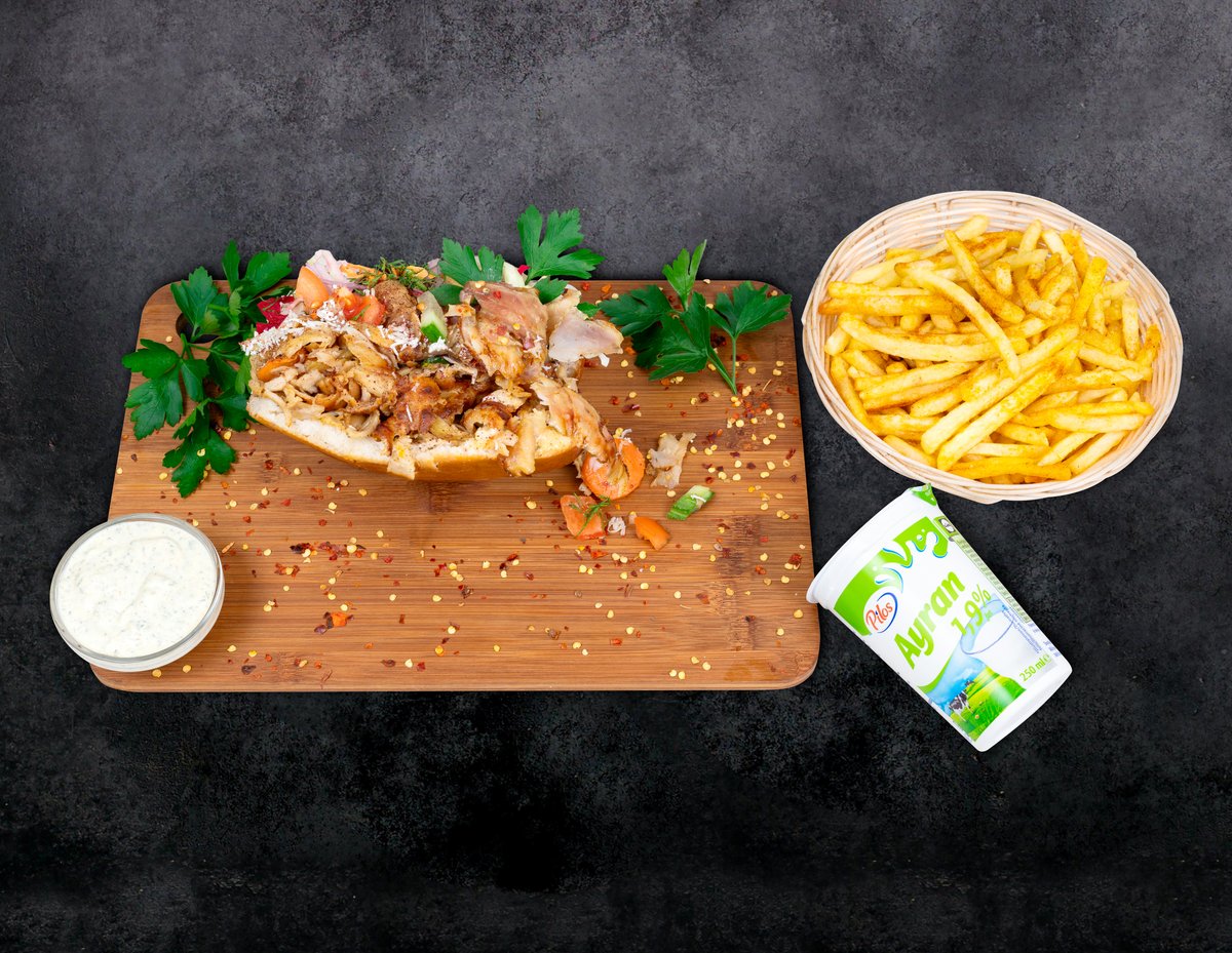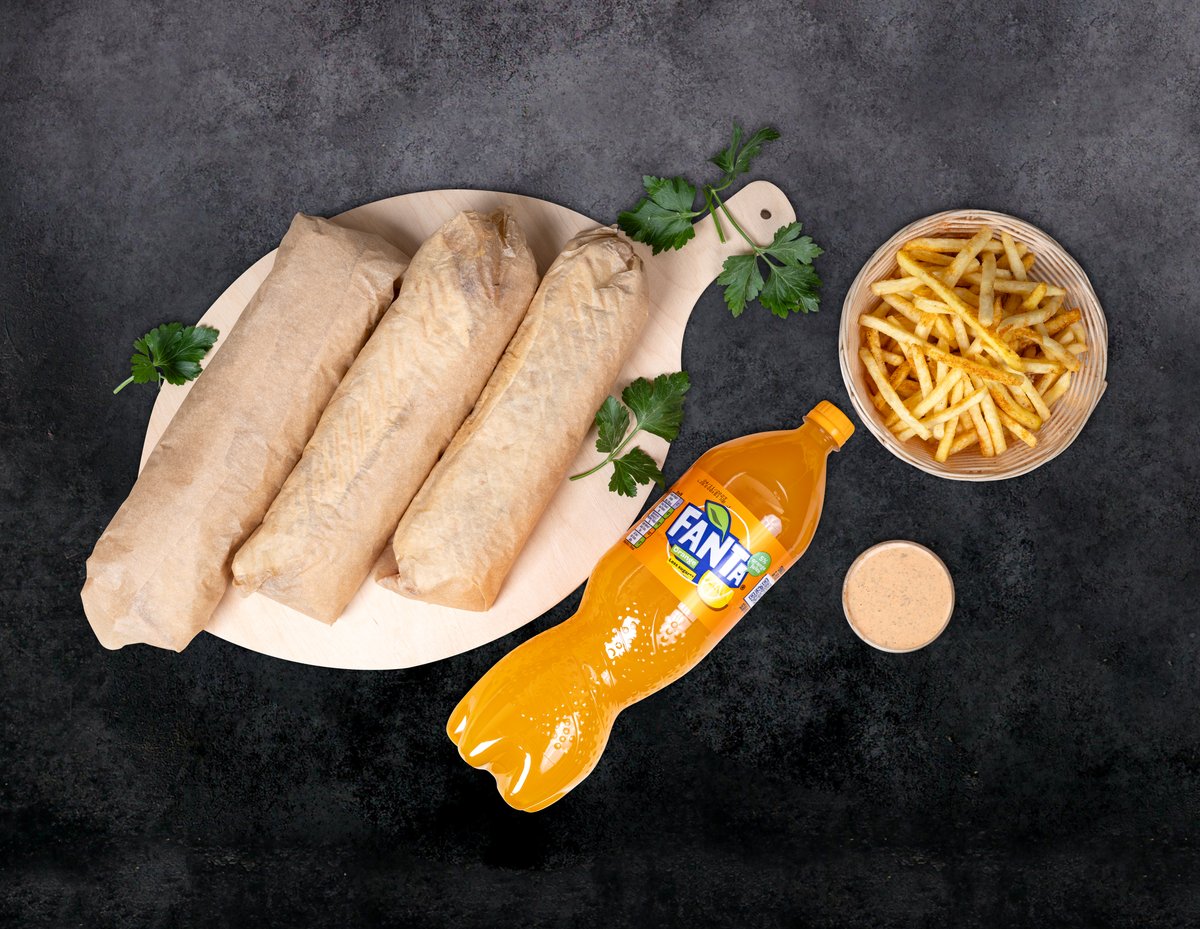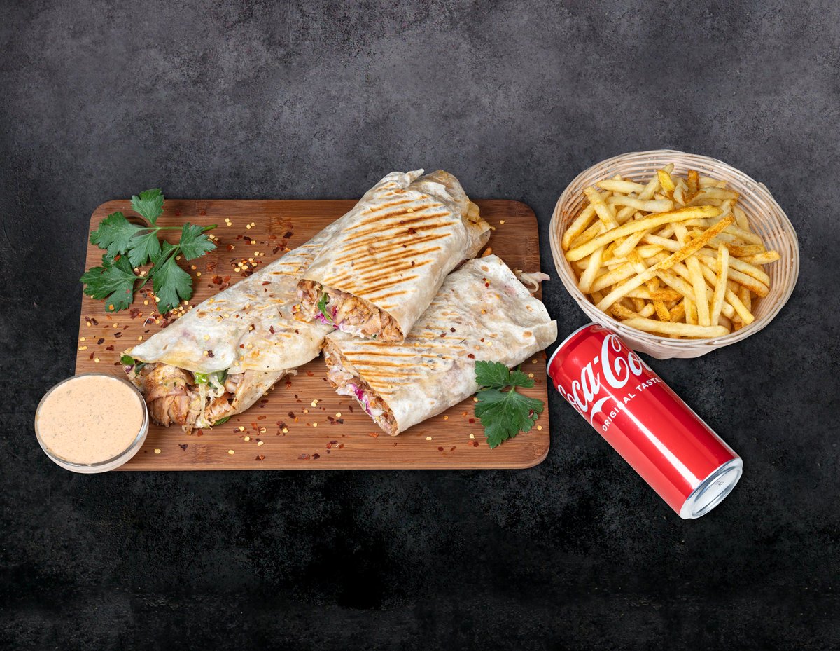 Frī kartupeļi+dzēriens+ēdiens. Turku pašu gatavota maize, vista, ķiploku mērce, jogurta mērce, asā mērce, salāti (aisberga salāti, sarkanie kāposti, burkāni, pētersīļi, sīpoli, sarkanie sīpoli, tomāts, gurķis), halapeno fetas siers, citronu sula virsū pēc izvēles