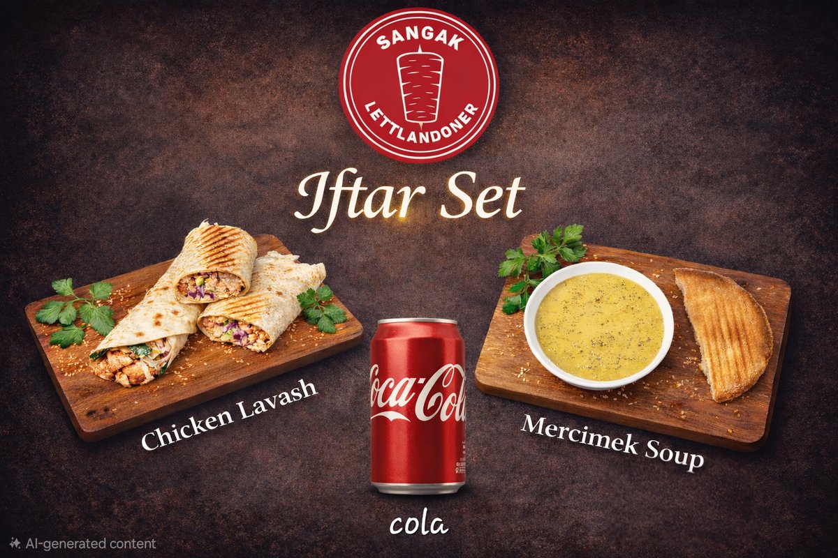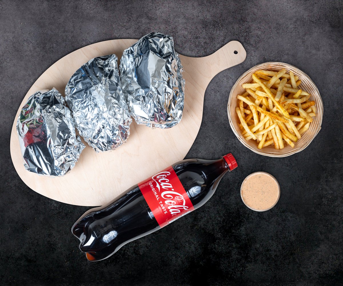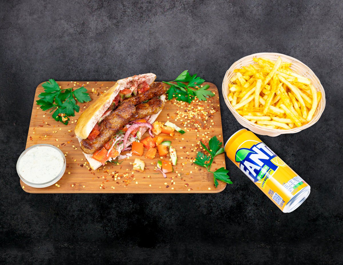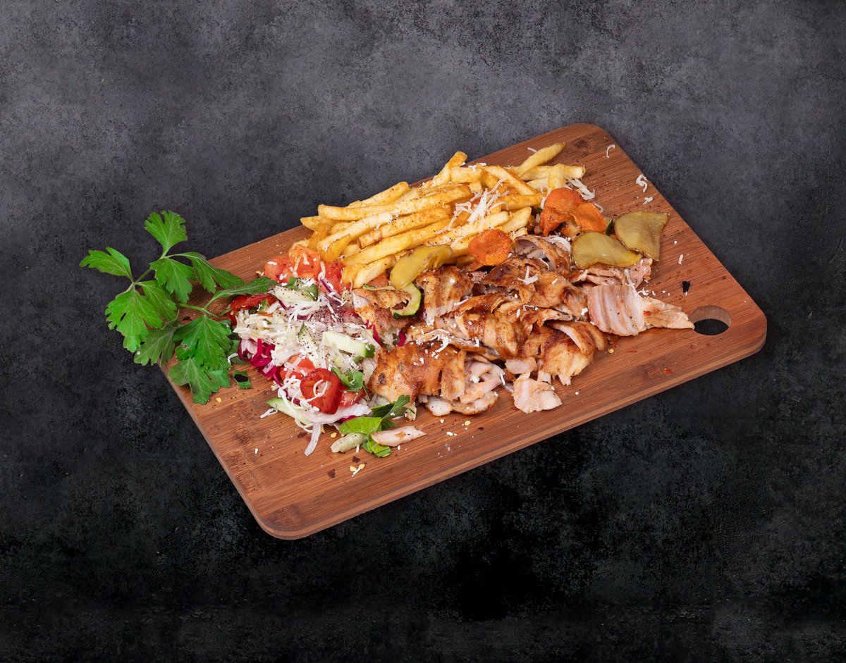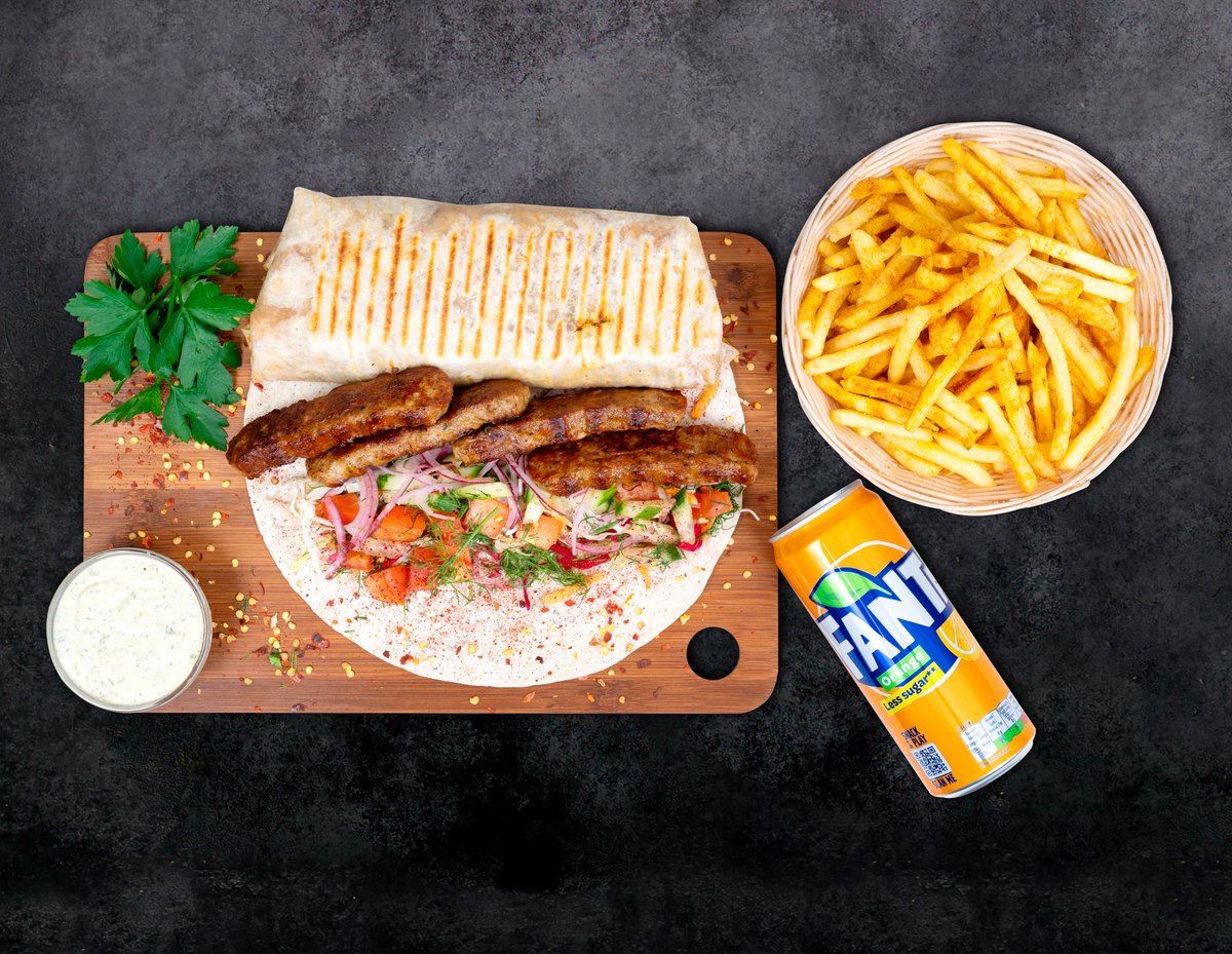 Frī kartupeļi+dzēriens+ēdiens. Turku pašu gatavota maize, vista, ķiploku mērce, jogurta mērce, asā mērce, salāti (aisberga salāti, sarkanie kāposti, burkāni, pētersīļi, sīpoli, sarkanie sīpoli, tomāts, gurķis), halapeno fetas siers, citronu sula virsū pēc izvēles
