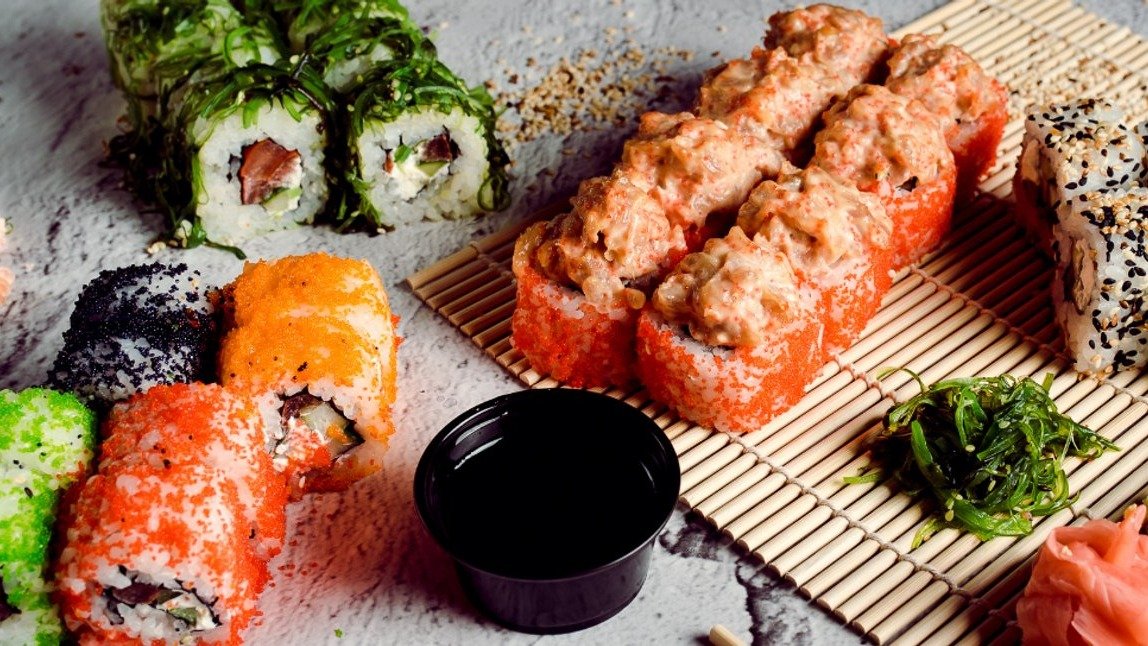 Nori, suši rīsi, tuncis, lasis, zutis, jūraszāles, TomYum pasta, tempura mīkla, panko, terijaki mērce, pikanta mērce.