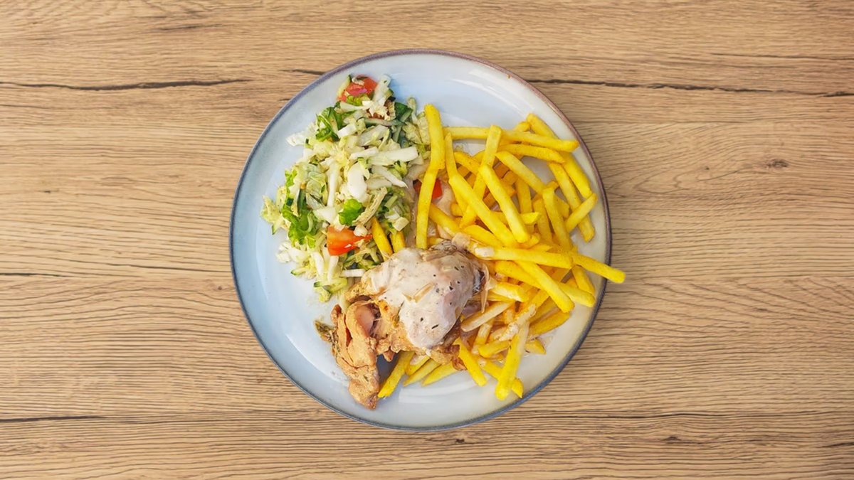 Smalki grieztas vistas filejas plācenīši. Ar kartupeļu biezeni un gurķiem. Attēli ir orientējoši un tikai ilustratīviem nolūkiem. Iepakojums ir iekļauts ēdiena cenā.