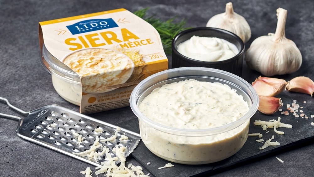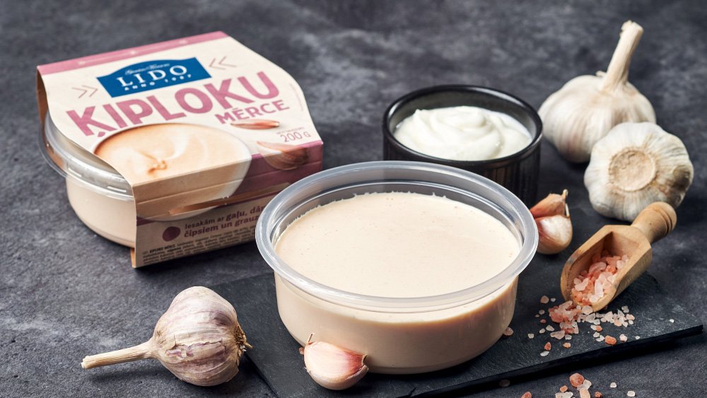 Majonēze (rapšu eļļa (67%), ūdens, cukurs, OLU dzeltenuma pulveris ar maltodekstrīnu, VĀJPIENA pulveris, sāls, skābuma regulētāji: citronskābe, etiķskābe, dzeramā soda, biezinātāji: pārveidota kukurūzas ciete, aromatizētājs, krāsviela: beta karotīns), SKĀBAIS KRĒJUMS, siers (19.6%) (pasterizētais PIENS, sāls, mikrobioloģiskas izcelsmes ferments, krāsviela: beta karotīns, bakētriju kultūras (no PIENA)), ķiploki, rapšu eļļu, dilles, sāls, SINEPES (ūdens, SINEPJU PULVERIS, cukurs, rapšu eļļa, skābuma regulētājs: etiķskābe, sāls, garšvielas)