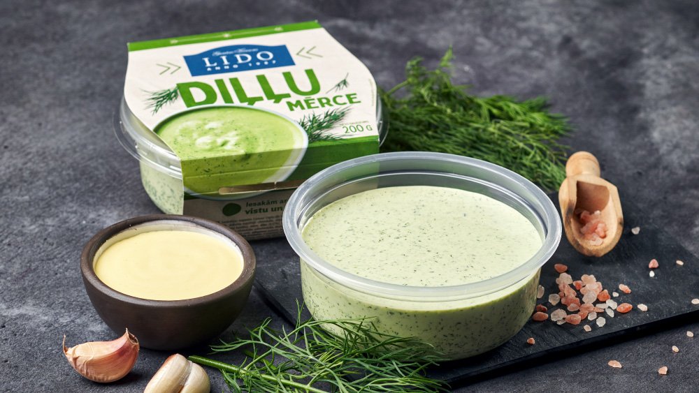 majonēze (rapšu eļļa (67%), ūdens, cukurs, OLU dzeltenuma pulveris ar maltodekstrīnu, VĀJPIENA pulveris, sāls, skābuma regulētāji: citronskābe, etiķskābe, dzeramā soda, biezinātāji: pārveidota kukurūzas ciete, aromatizētājs, krāsviela: beta karotīns), ūdens, dilles (9.57%), cukurs, SINEPES (ūdens, rapšu eļļa, SINEPJU PULVERIS (7%), skābuma regulētāji: etiķskābe, citronskābe, askorbīnskābe, ābolskābe, pārtikas sāls, OLU DZELTENUMA PULVERIS, biezinātāji: ksantāna sveķi, guāra sveķi, PILNPIENA pulveris, krāsviela: luteīns, saldinātājs: saharīns, konservants: nātrija benzoāts, SINEPJU sēklu aromatizētājs), sāls