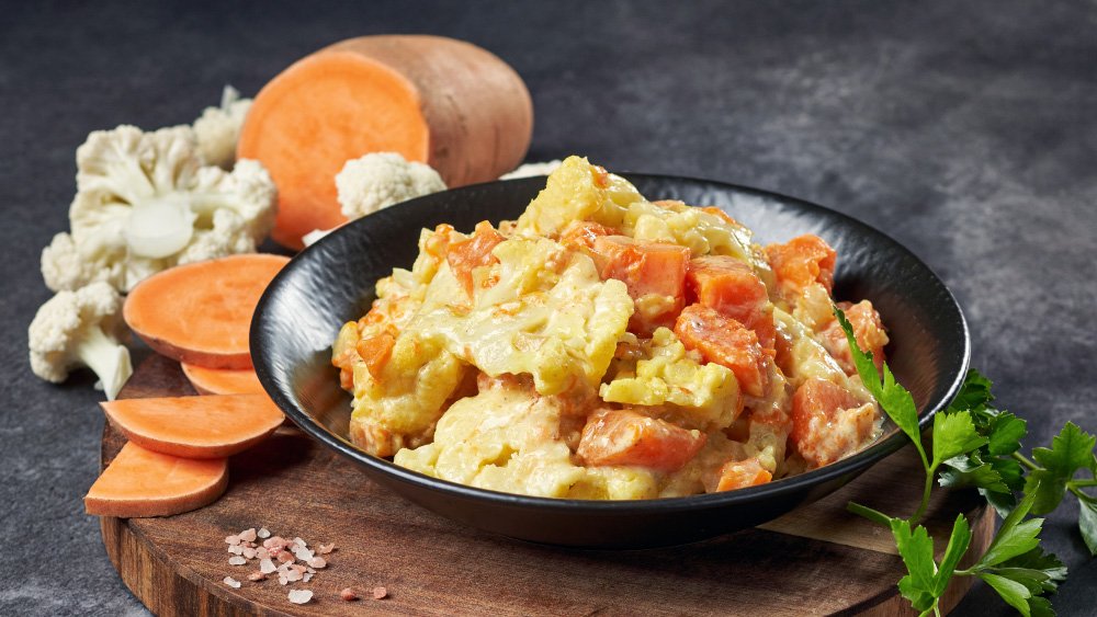 Puķkāposti (33.6%), brokoļi (33.6%), sagatave (paprika sarkanā (49.6%), burkāni (19.8%), sīpoli (15.9%), rapšu eļļa, ķiploki, sāls, universāla garšviela Aroma Mix (bez sāls) (pētersīļi, kartupeļu ciete, kurkuma, ingvera pulveris, pipari melnie malti, burkānu granulas, pastinaka granulas, SELERIJAS SAKNES, sīpolu granulas, ķiploku granulas, dilles), melnie pipari, timiāns kaltēts)