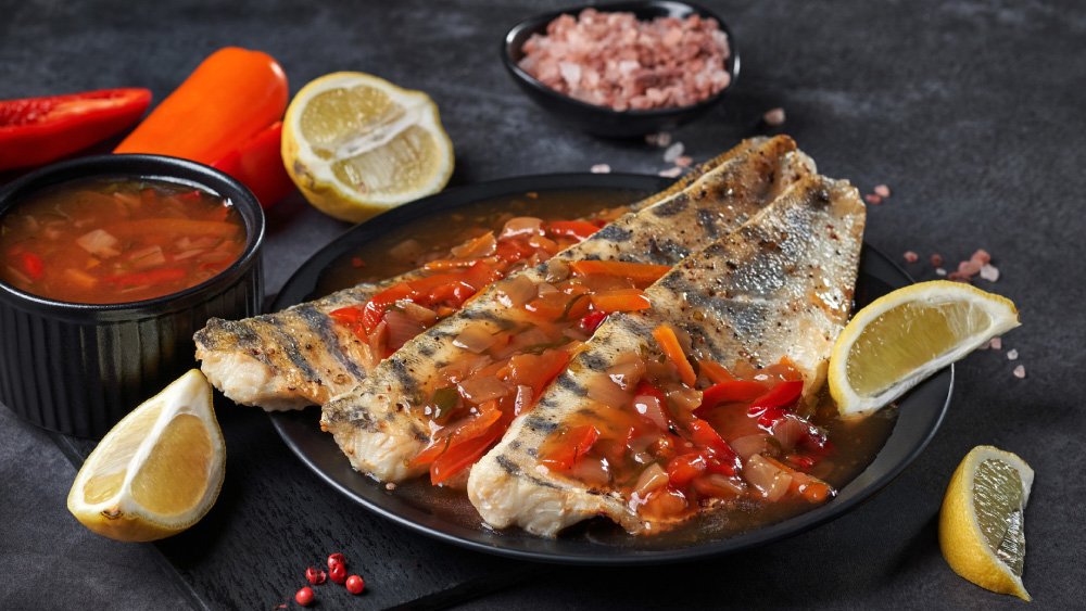 Biešu salāti ar marinētiem gurķiem Mintaja fileja ar tomātiem un sieru Rīsi ar dārzeņiem un sēnēm Diļļu mērce