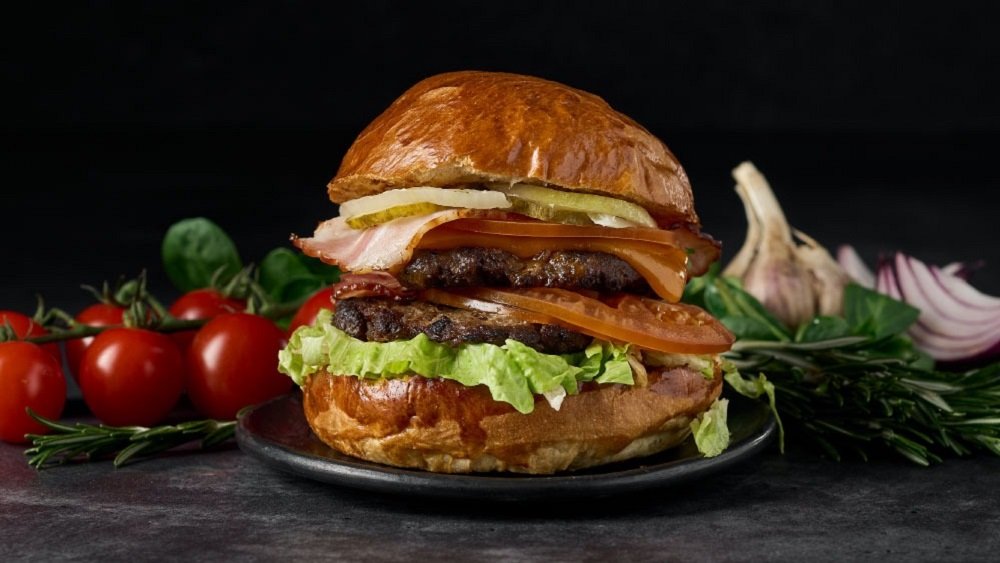 Burgera maize, liellopu gaļas kotlete, mērce burgerim, siers, cūkgaļas krūtiņa kūpināta, gurķis marinēts, sīpoli sarkanie marinēti, tomāti