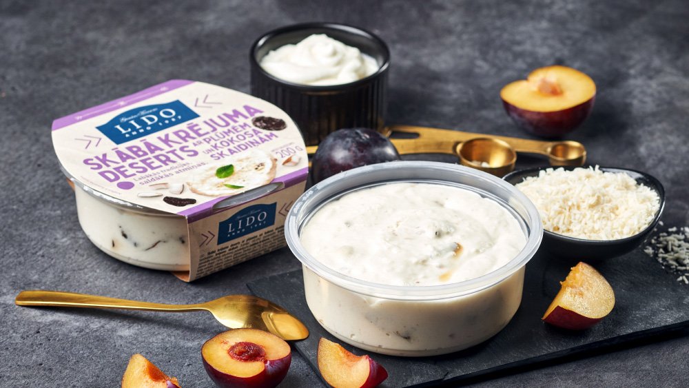 Skābā krējuma deserts ar plūmēm un kokosa skaidiņām (200g)