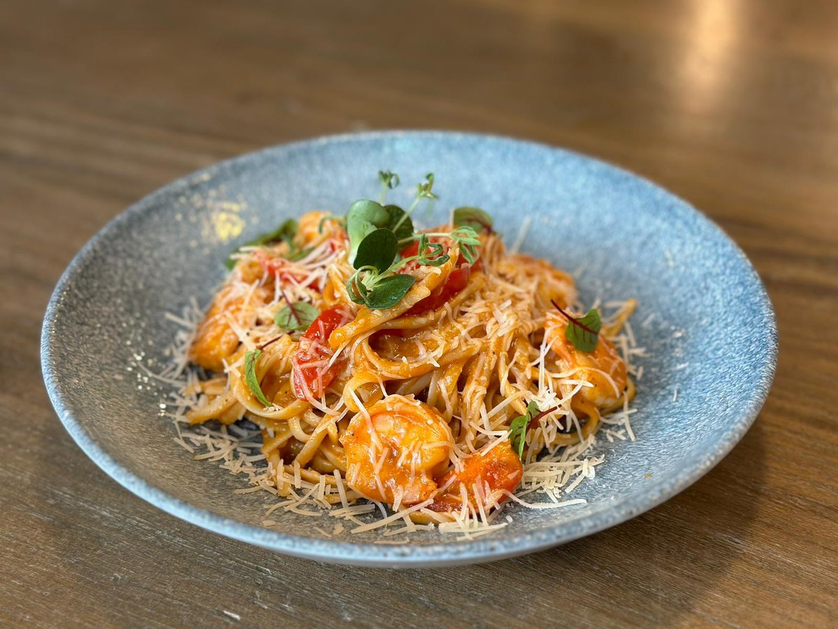 Lingvini makaroni, cherry tomāti, čilli, pašgatavota tomātu mērce, tīģergarnelēs, svaigie spināti, parmezāna siers