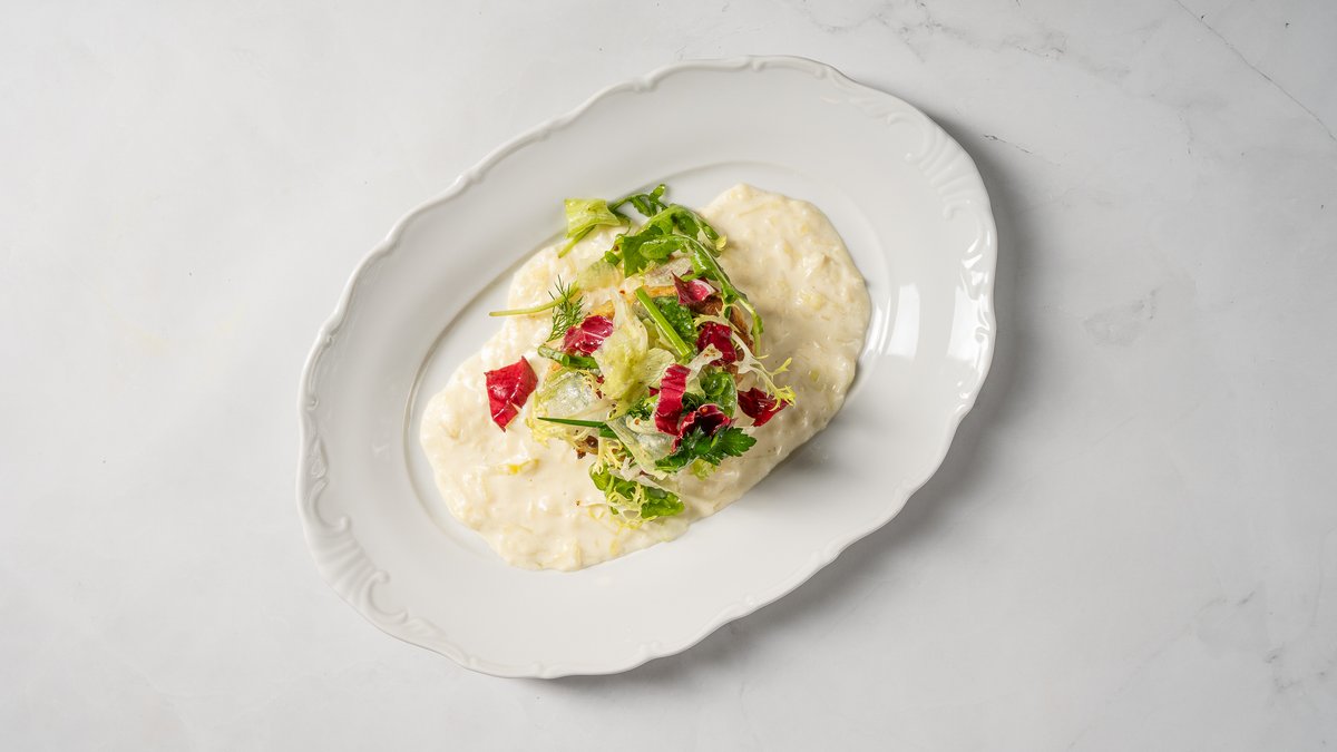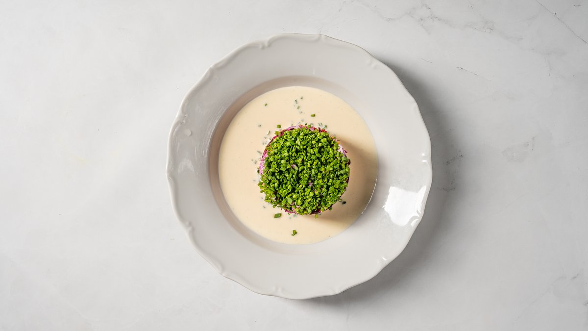 Siļķe kažokā ar sālītām vīnogām un krējuma–sīpolu mērci
