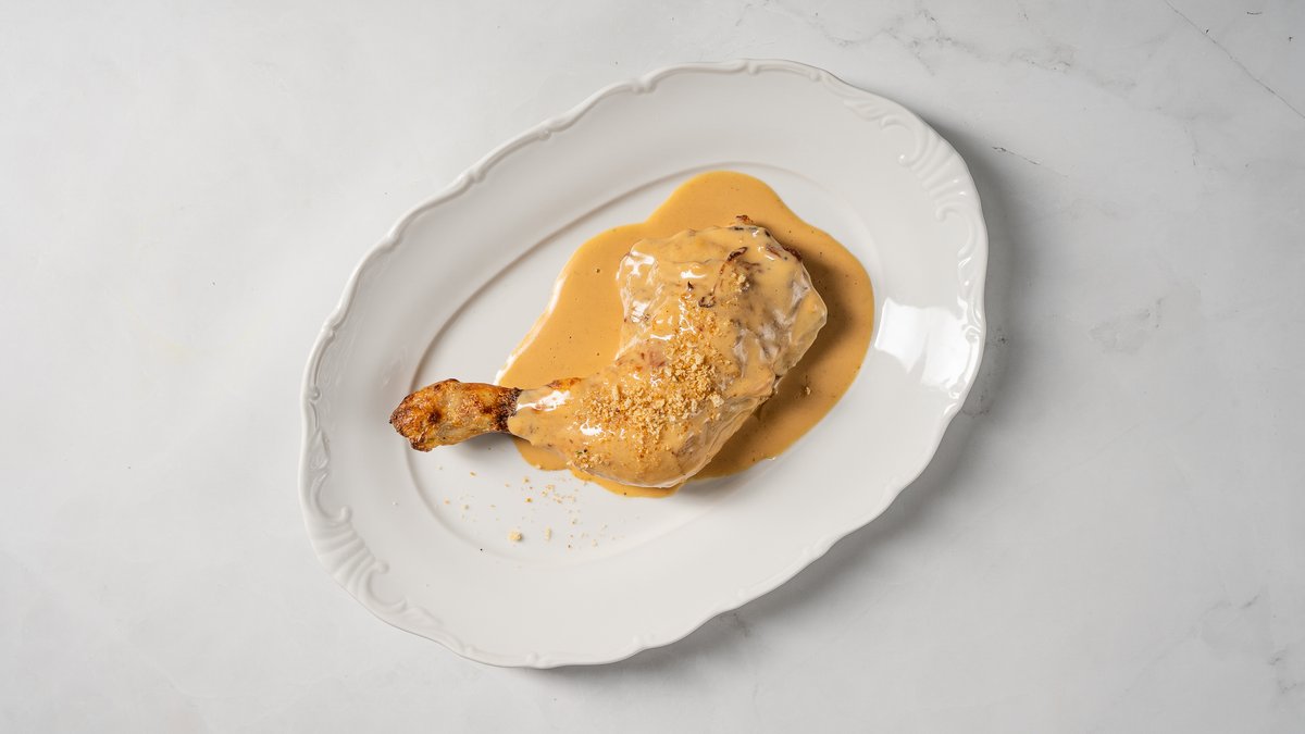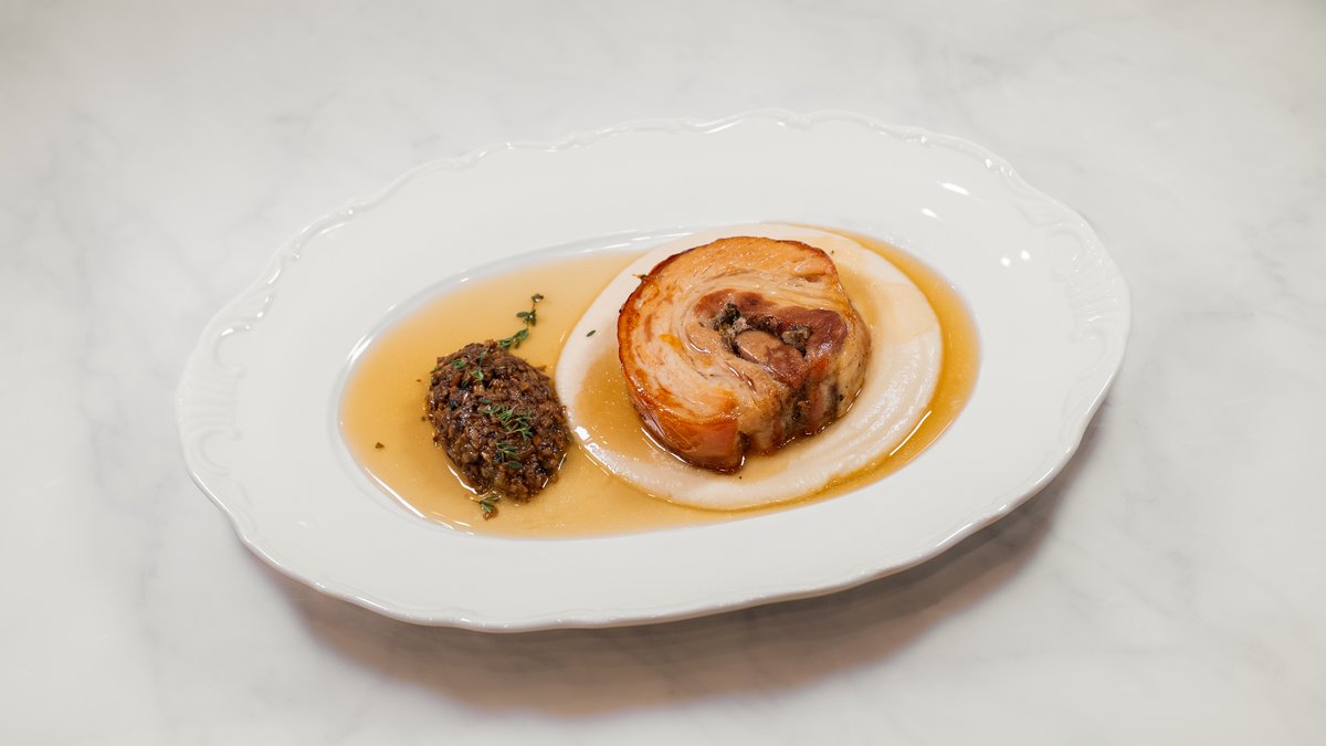 Pildīta pankūka ar kūpinātu lauku sivēna pavēderi un sešus mēnešus nogatavinātu "Vecsiljāņu" sieru