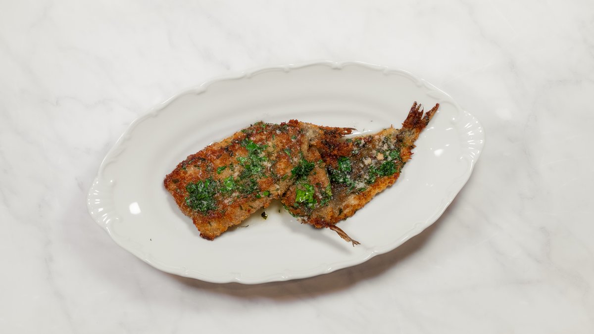 Panētas reņģes ar mārrutku garšaugu sviesta mērci
