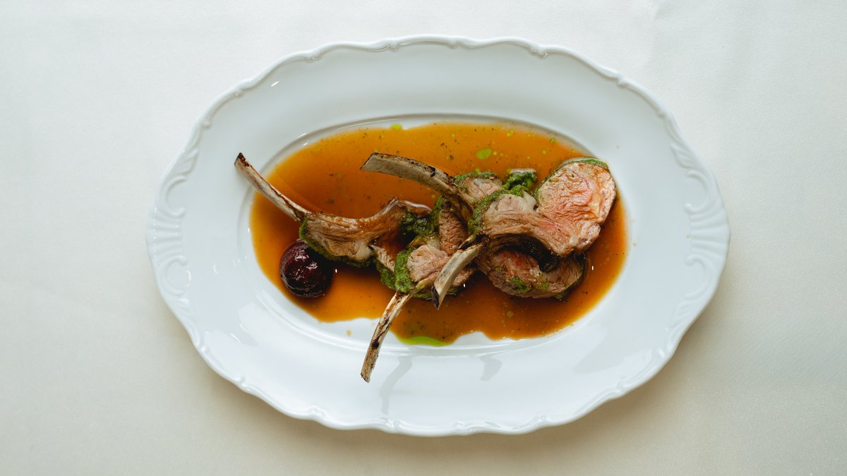 Jēra ribiņas garšaugu kažokā ar upeņu biezeni un sarkanvīna mērci
