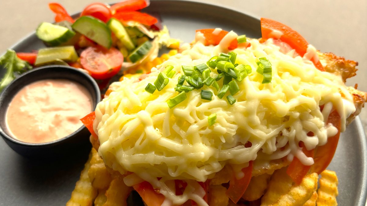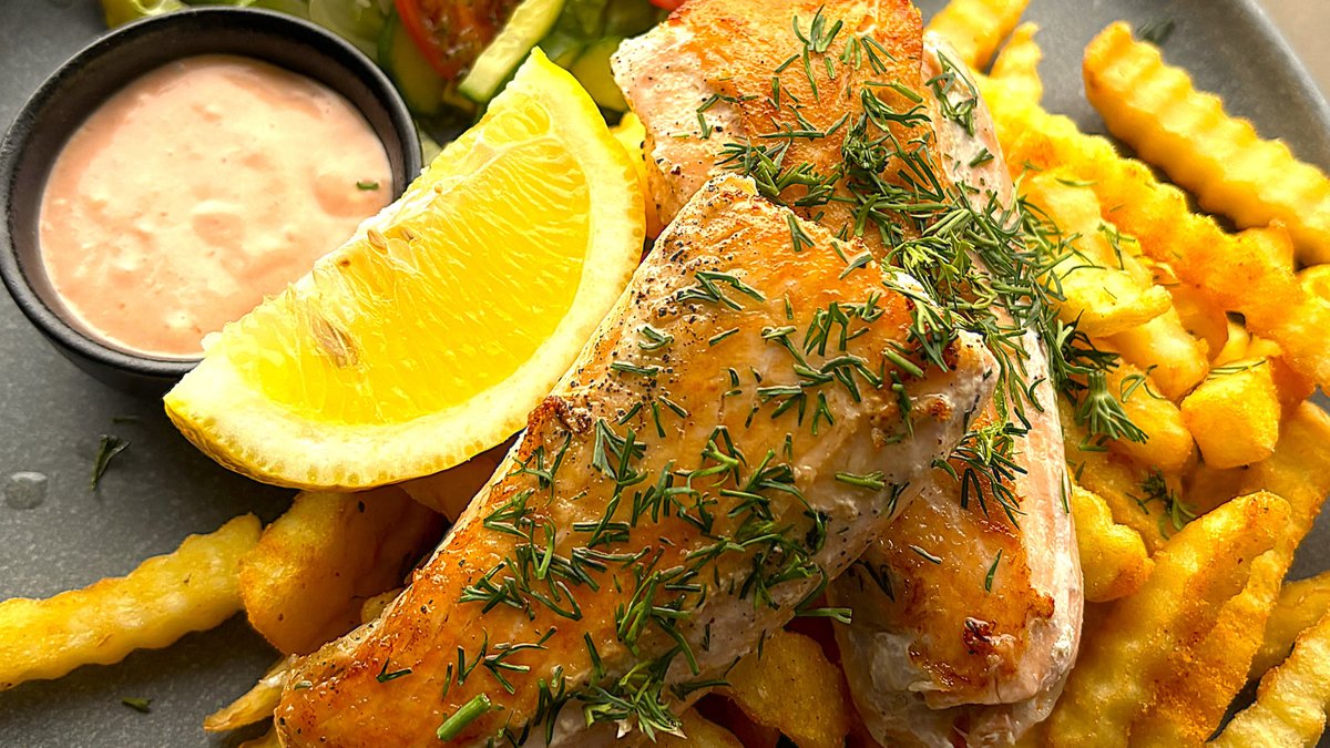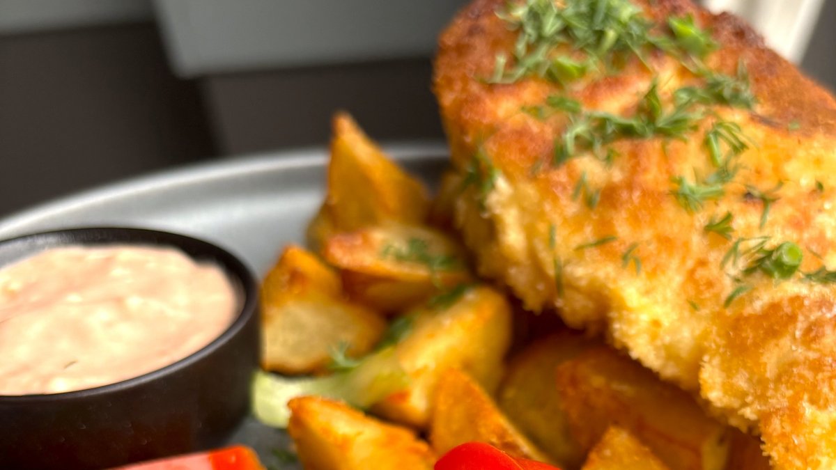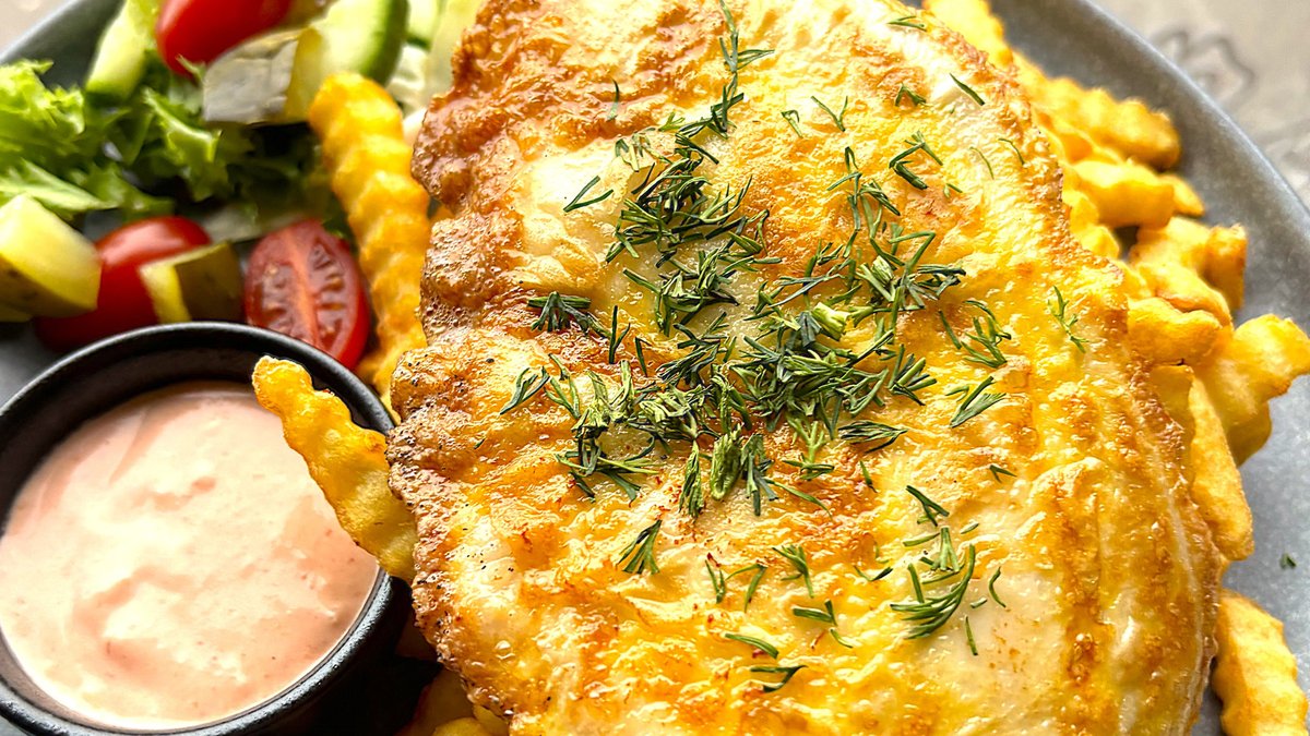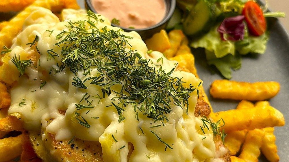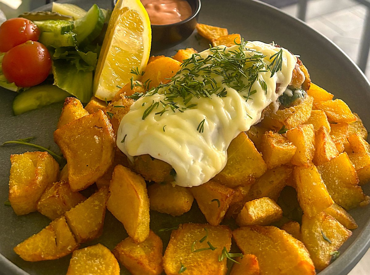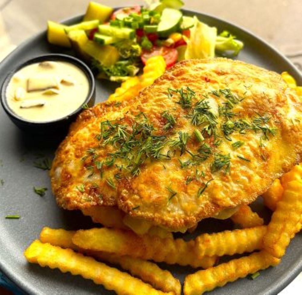 Vistas fileja ar sieru. Cepta maizīte, salātlapa, tomāts, marinēts gurķis un mērcīte, frī kartupeļi
