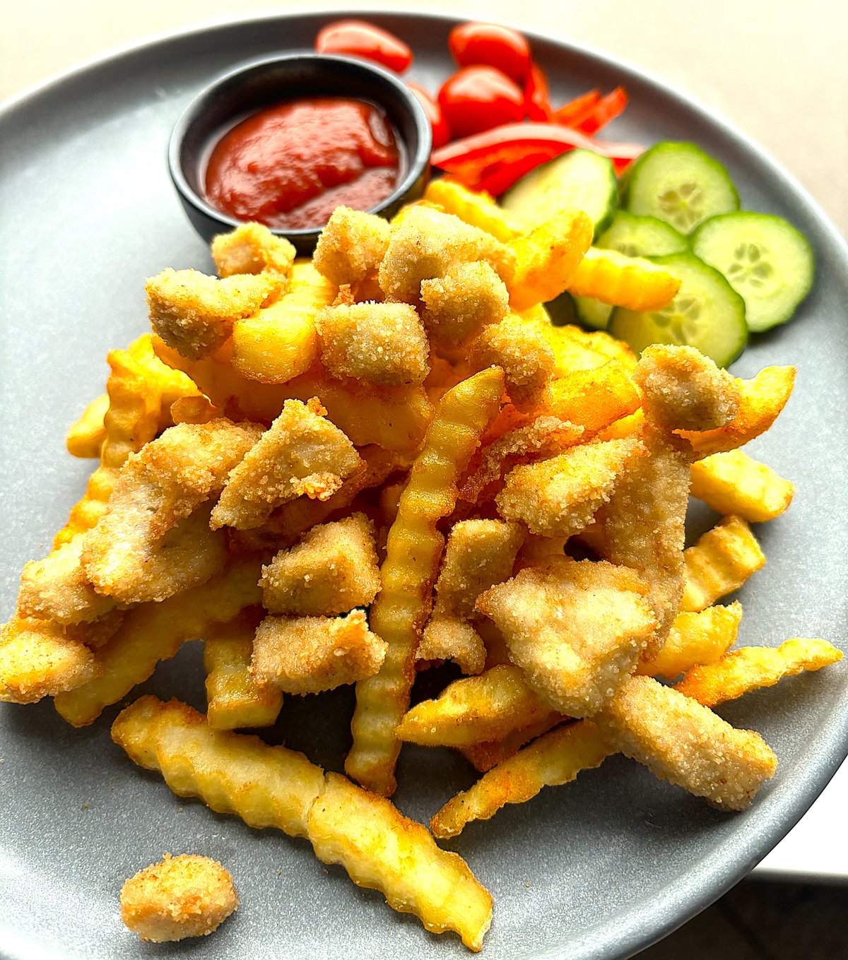 Vistas strēmelītes pasniegtas ar kartupeļiem frī un dārzeņiem