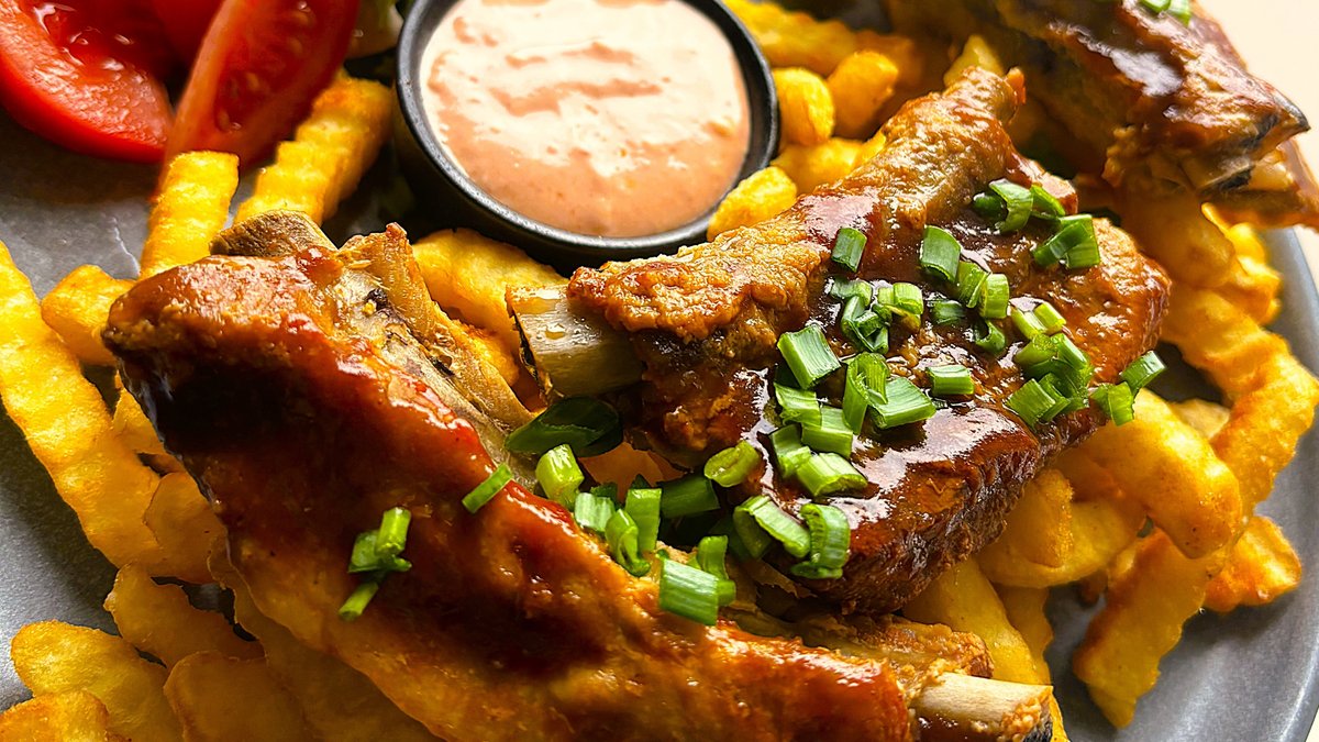 Sīpolu gredzeni, Kalmāru gredzeni, ķiploku grauzdiņi, frī kartupeļi, sezonālie dārzeņi, dips, siera mērce, sveet chilli mērce