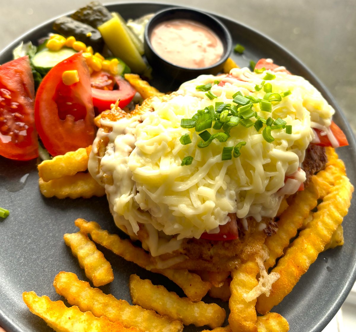 Liellopa gaļas kotlete,siers. Cepta maizīte, salātlapa, tomāts, marinēti sīpoli, marinēts gurķis, īpaši asa mērcīte, frī kartupeļi