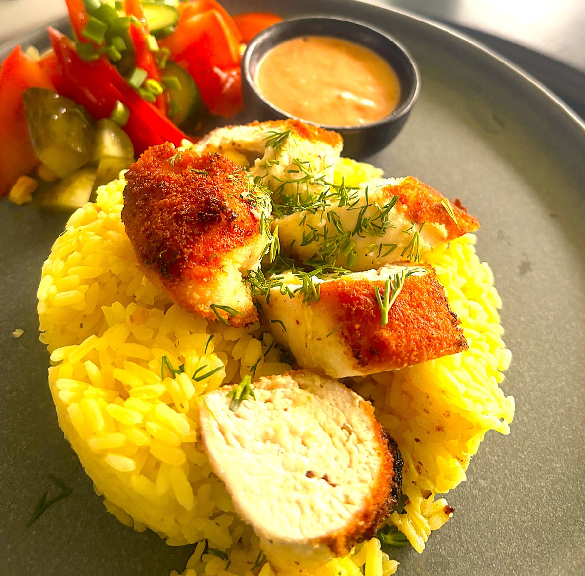 Cūkgaļas karbonāde, vistas gaļas karbonāde, kraukšķīgā vista medus mērcē, dārzeņu salāti, 3 veidi mērces