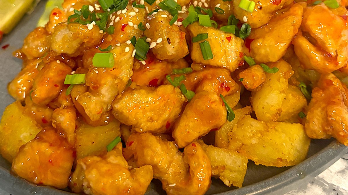 cūkgaļa,paprika,cukīni,kartupelis,saldā čilli un steika mērce
