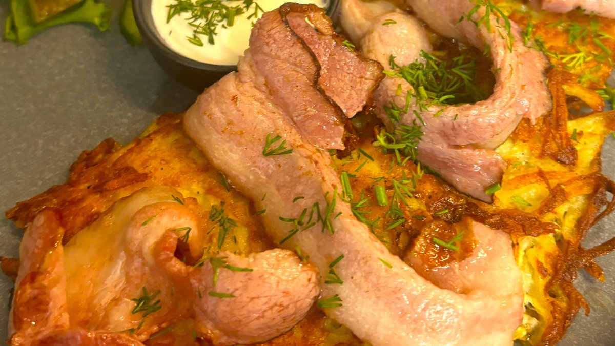 cepti pelmeņi, bekona-saldkrejuma mērce, siers