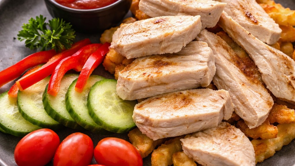 Grillēti vistas gabaliņi ar kartupeļiem frī un dārzeņiem
