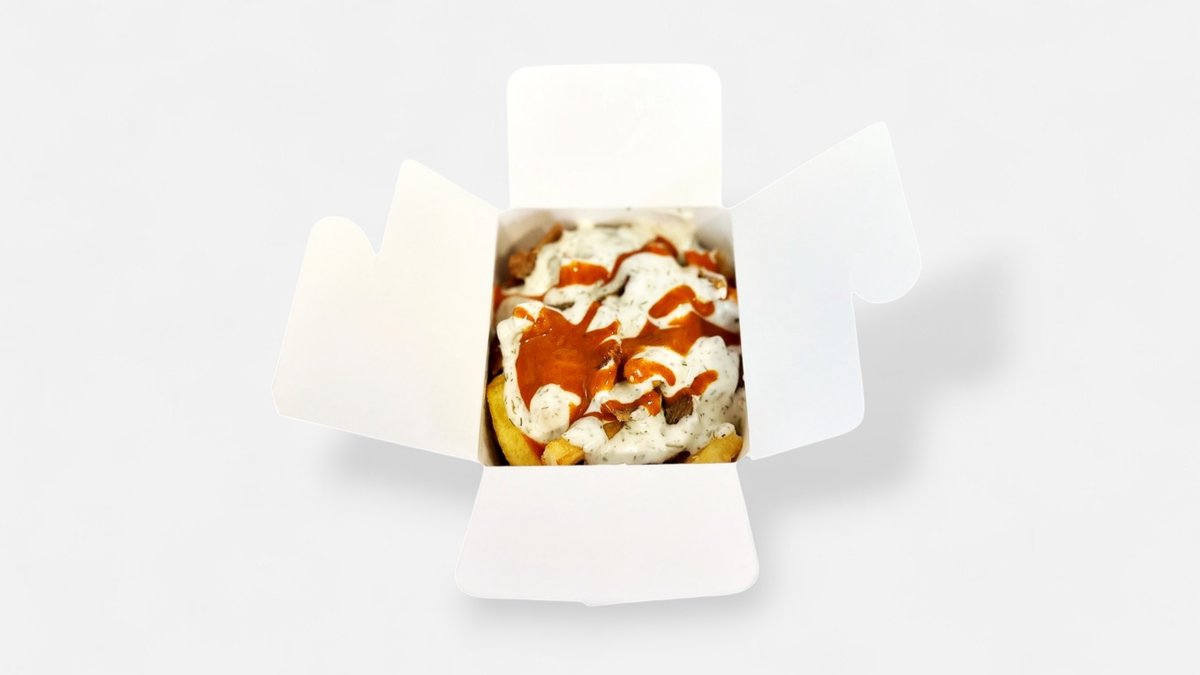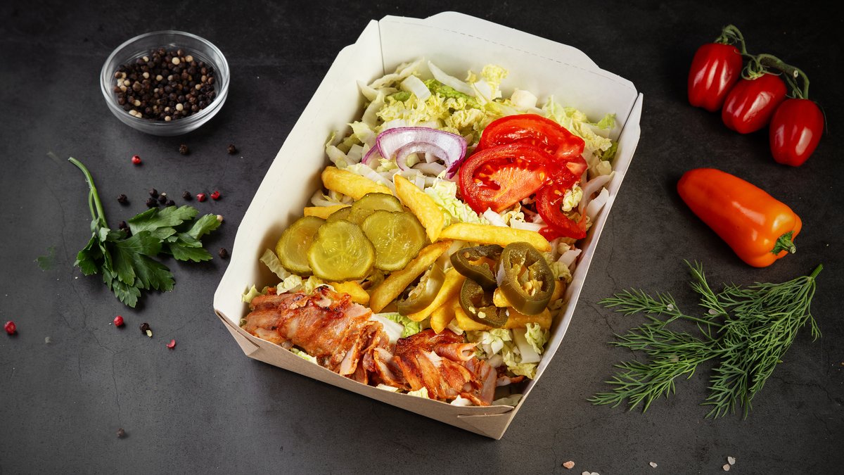 kartupeļi frī, gaļa, mērce, tomāti, ķīnas kāposti, marinētie gurķi, halapenjo, sarkani sīpoli