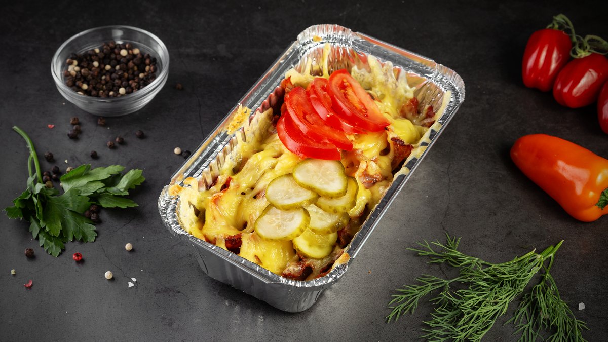 gaļa, siers, kartupeļi frī, marinētie gurķi, tomāti