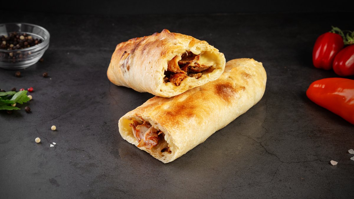 sastāvdaļas - mīkla pēc kaukāzu receptiem, siers 2 veidi, vistas girosa gaļa, tomāti, picas mērce