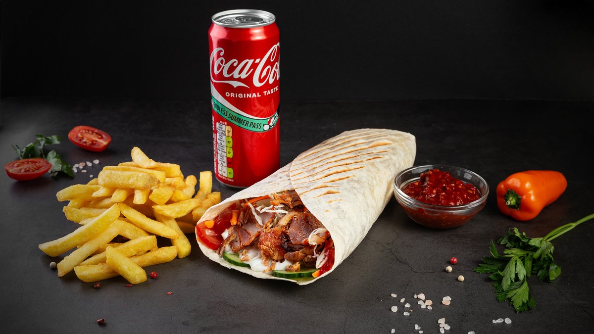 Vistas kebabs lavašā (vidējais), kartupeļi fri, mērce, dzēriens 0,33L