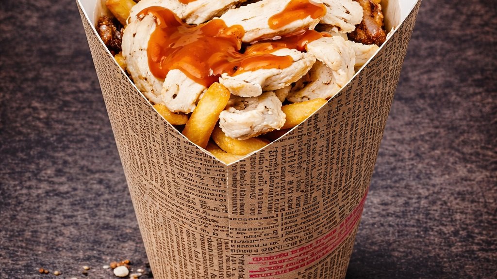 kartupeļi frī, gaļa, mērce, tomāti, ķīnas kāposti, marinētie gurķi, halapenjo, sarkani sīpoli