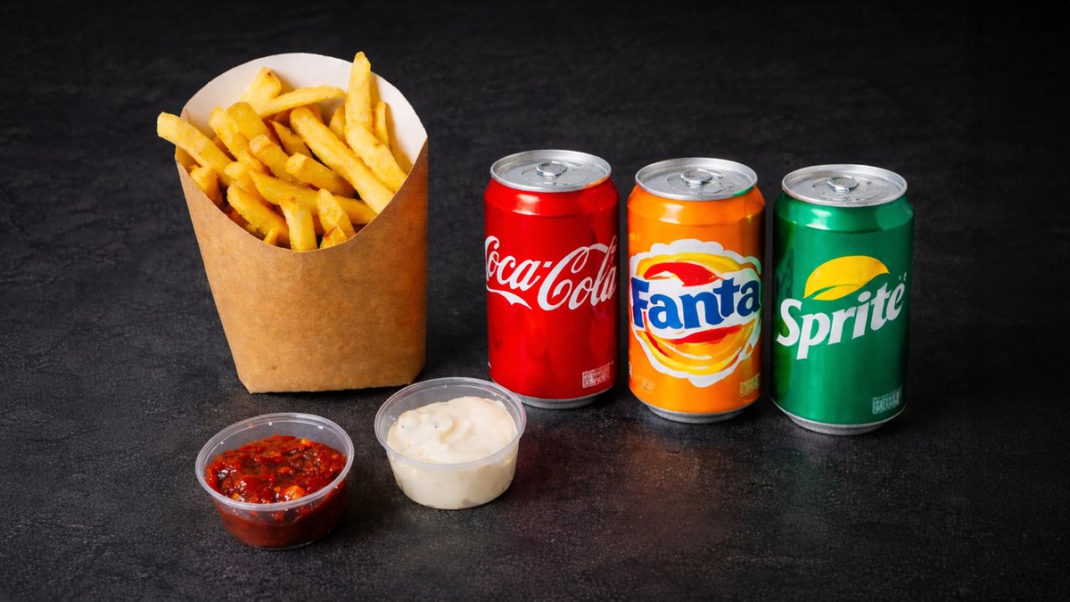 Kebabs maizē ar vistas gaļu, kartupēļiem fri, mērci un dzērienu 0,33L