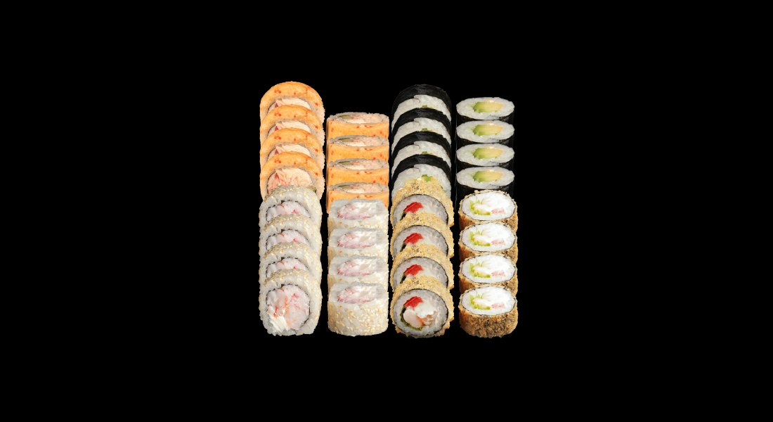 8 gab, avokado, sniega krabis, gurķi, lidojošās zivs ikri, lasis + 8 gab, avokado, garneles, Filadelfijas siers, gurķi, karstā mērce