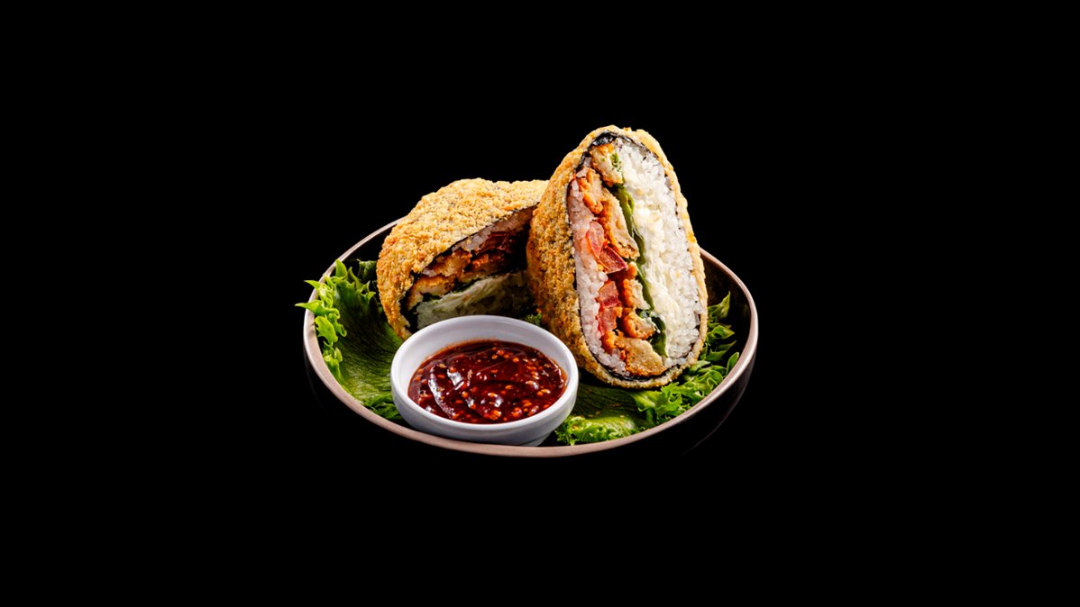 Kraukšķīgā vista, Filadelfijas siers, salāti, tomāti, yakiniku mērce; Alergēni: Kvieši, krēmsiere, olas, soja, zivis, sinepes