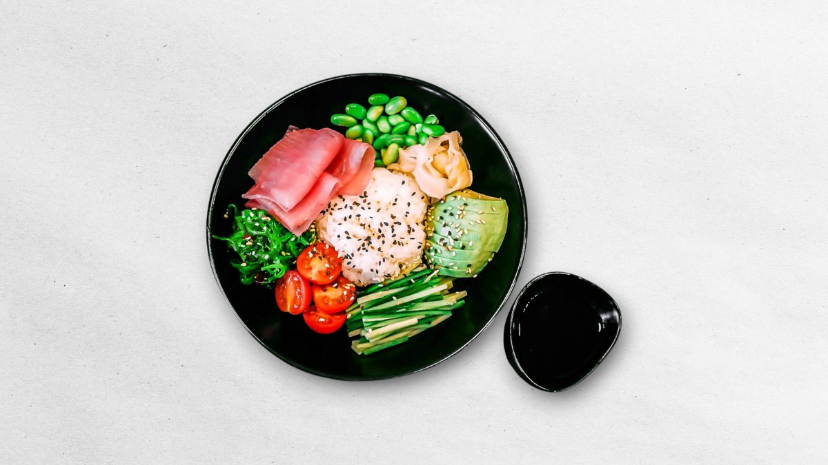 Poke bļoda ar lasi, rīsiem, dārzeņiem un mērci