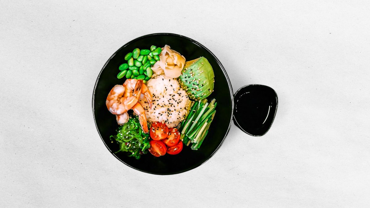 Garneļu poke ar rīsiem, sezamu un svaigām piedevām