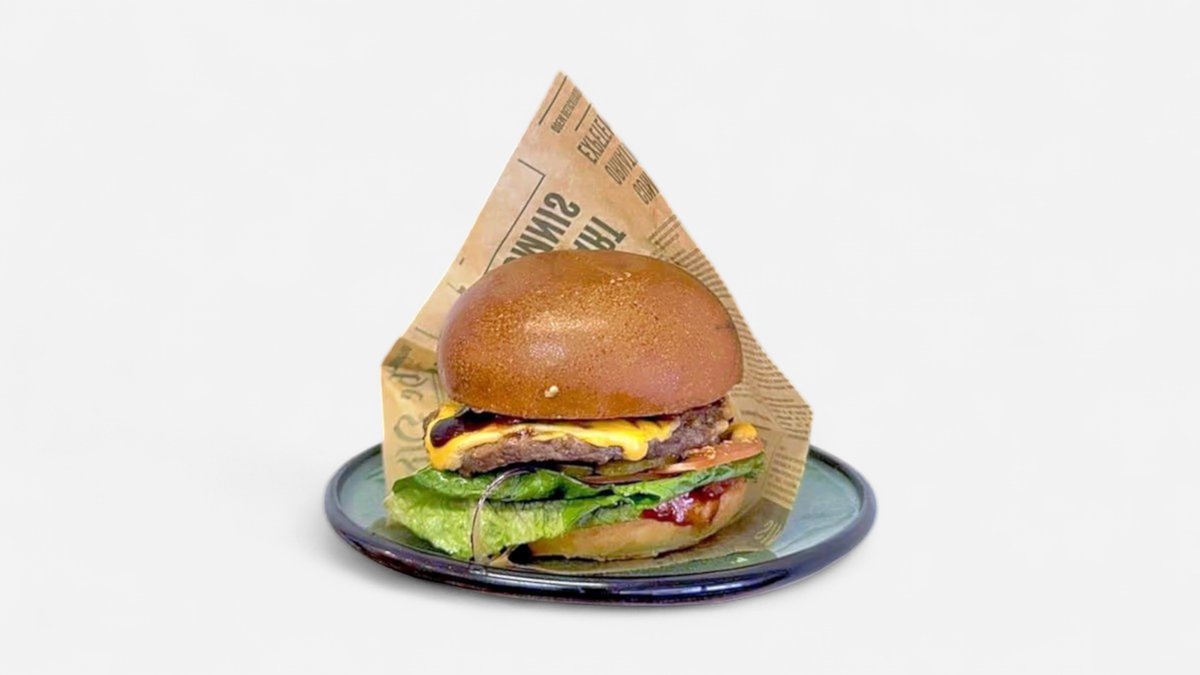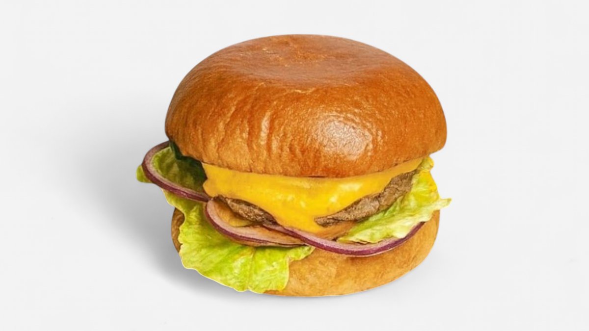 Brioša bulciņa, salātu lapas, tomāti, marinēti gurķi, čedaras siers, sīpoli, gurķu mērce, liellopa gaļas kotlete
