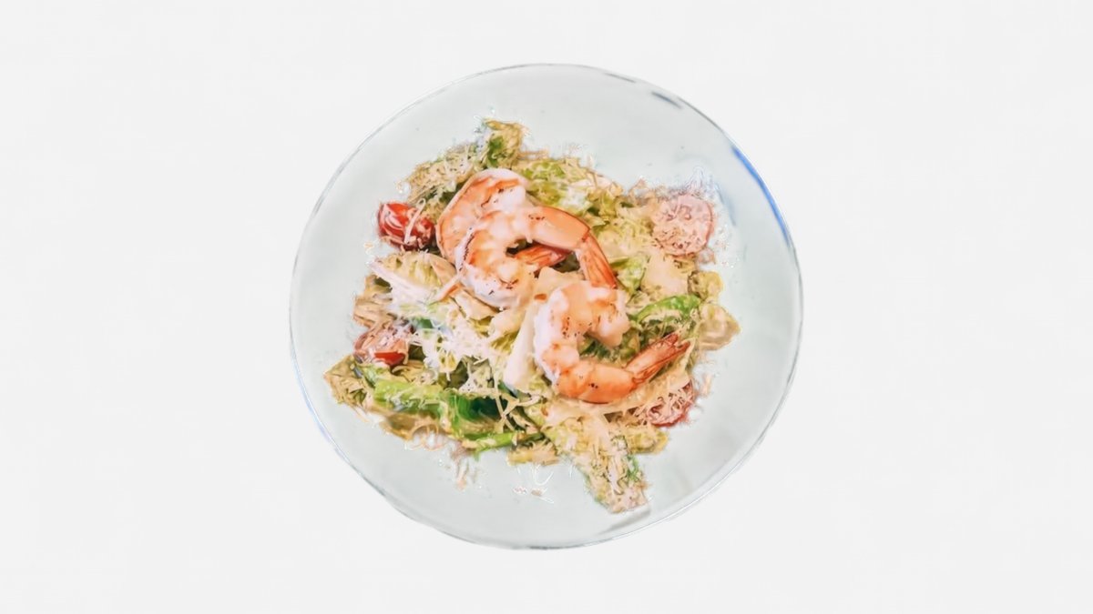 Tīģergarneles, romano salāti, cezars mērce, tomāti cherry, parmezāna siers