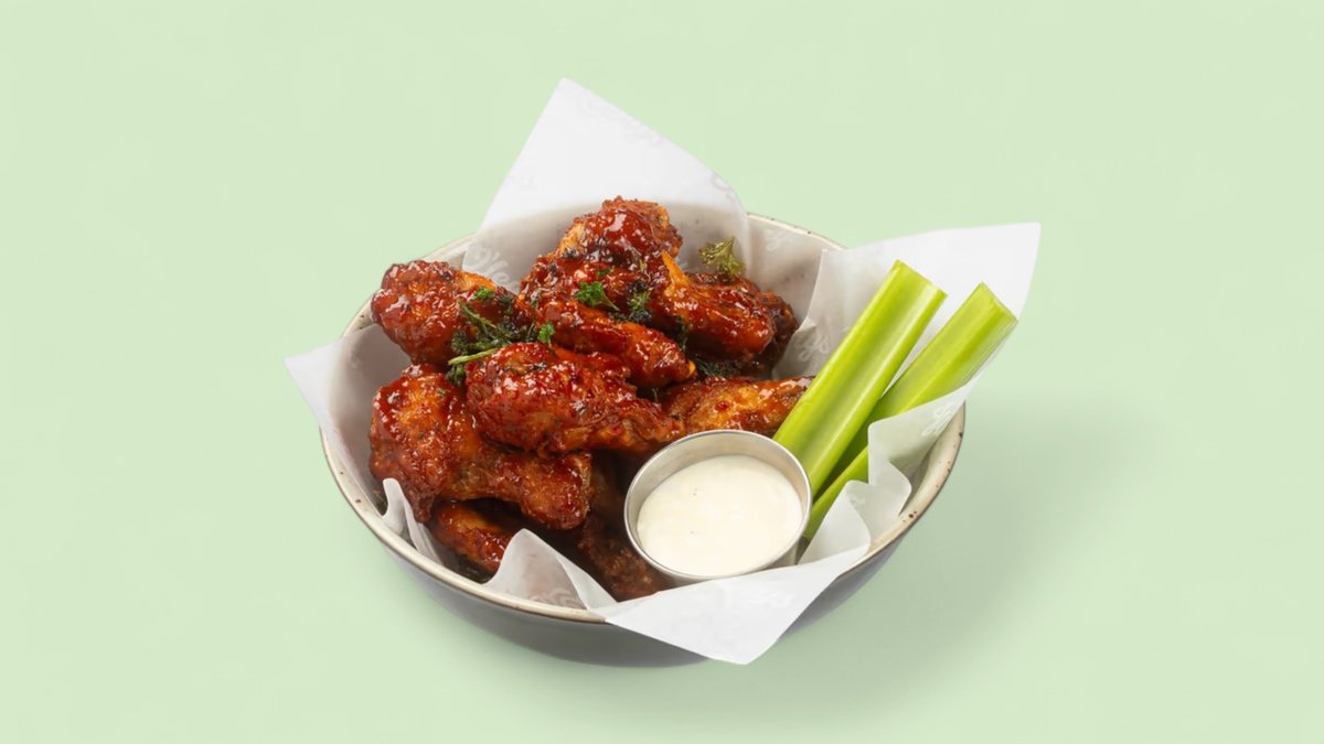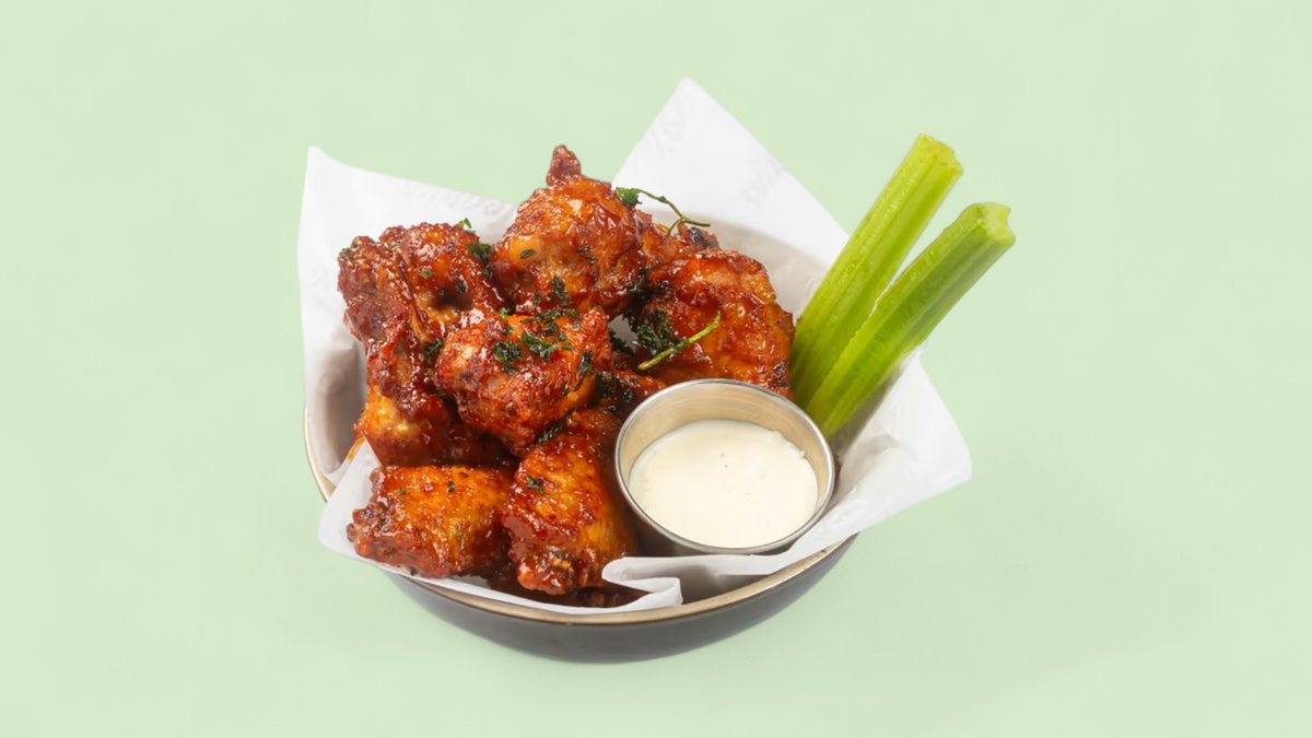 Fritēti vistas spārniņi, pasniegti ar kraukšķīgām seleriju nūjiņām, pikantu Buffalo un Ranch mērci.